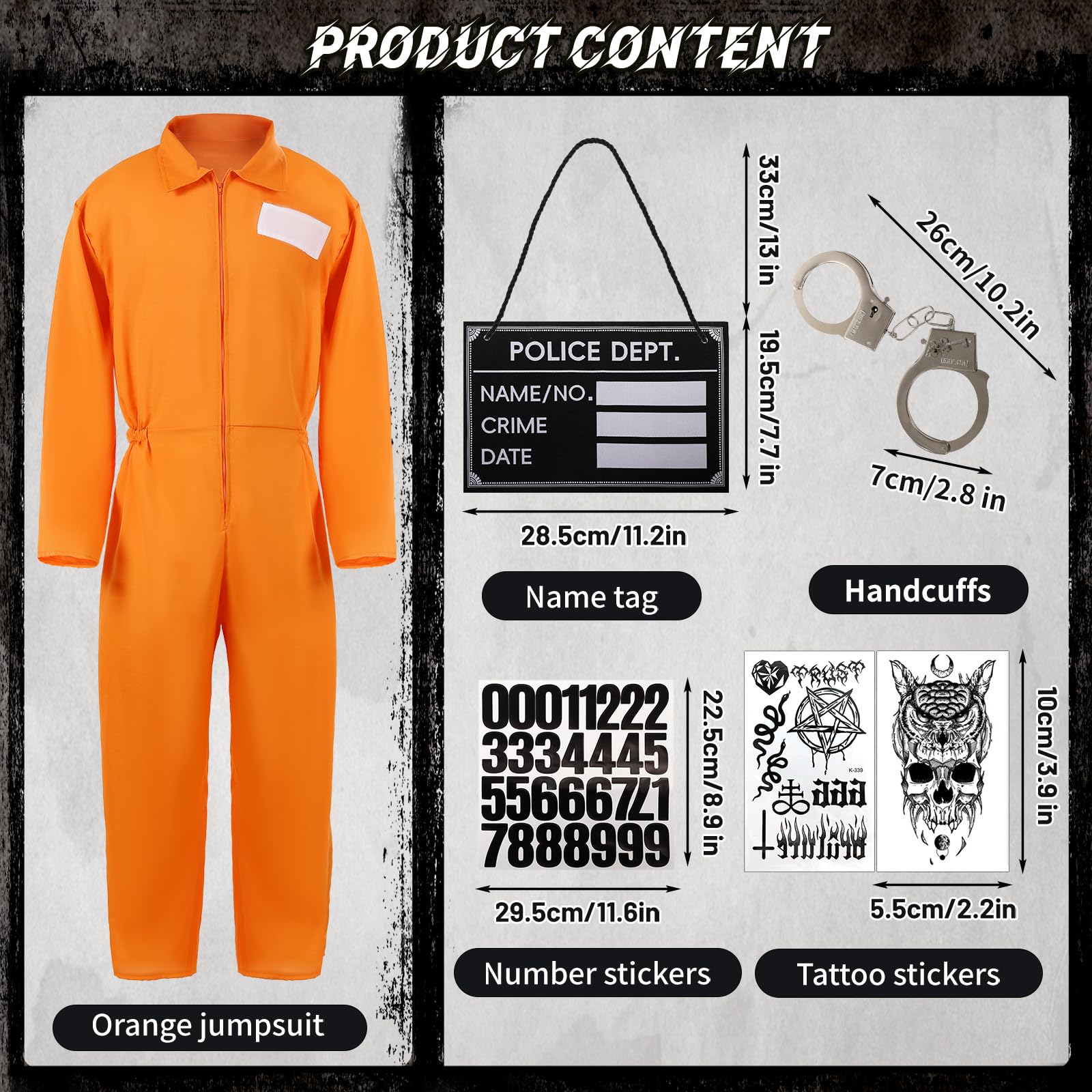 Prisoner Costume Set for Adults: You will receive 1 prisoner jumpsuit, 1 pair of handcuffs, 1 ID tag, 2 tattoo stickers, and 1 set of number stickers, orange prisoner jumpsuit comes with prisoner accessories, perfect for your prisoner cosplay costume or Halloween costume