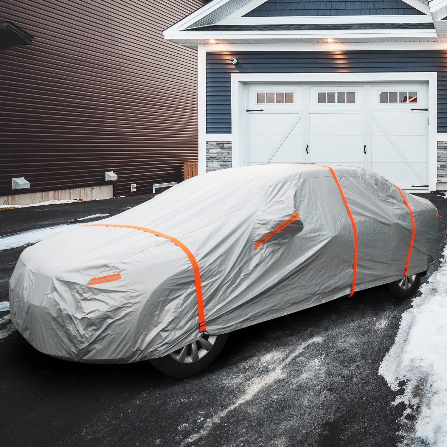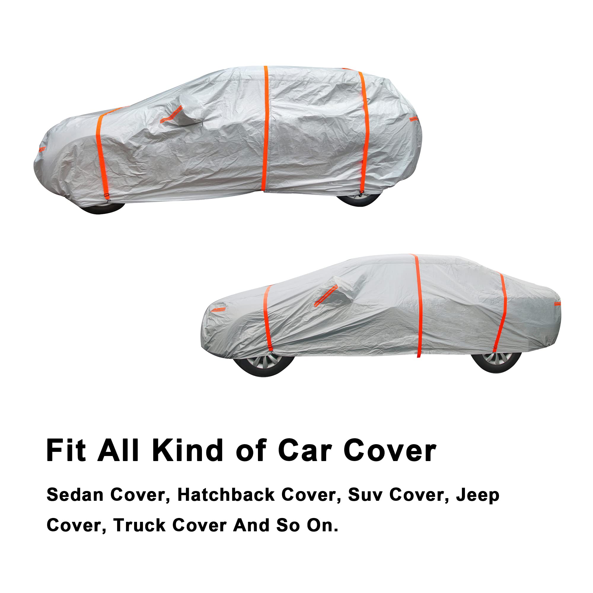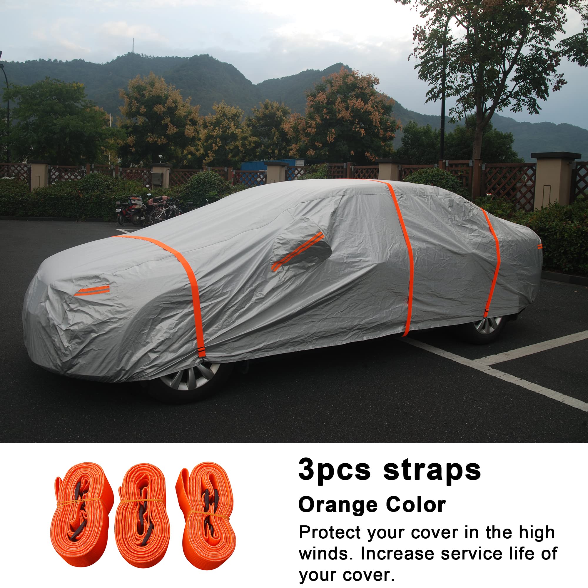 【3pcs Straps】Tie down the windproof straps in the front middle and rear of cover, protect your cover in the high winds. Increase service life of your car cover.