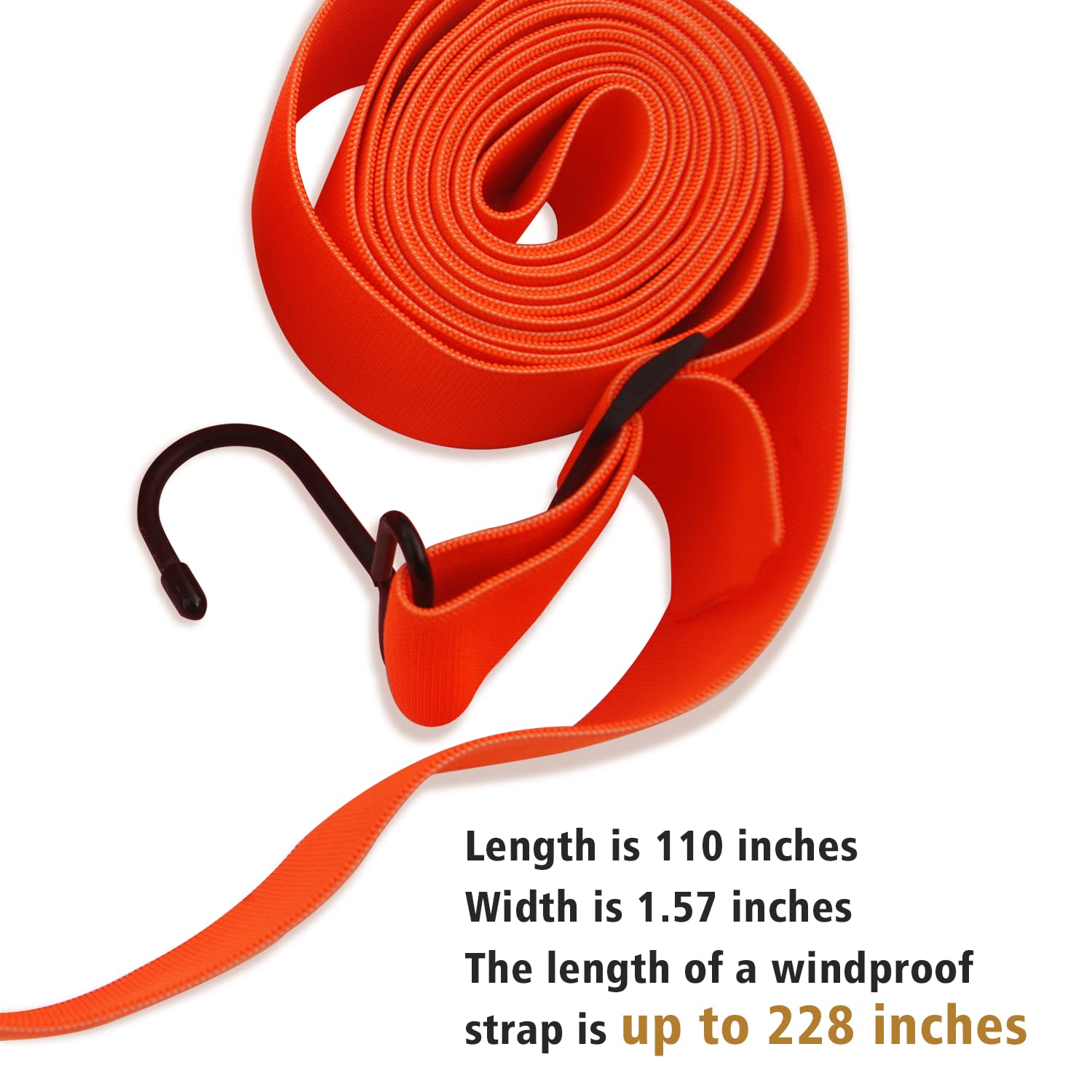 【High Elasticity】Car cover straps length is 110 inch, the width is 1.57 inch, the longest length is about 228 inch.