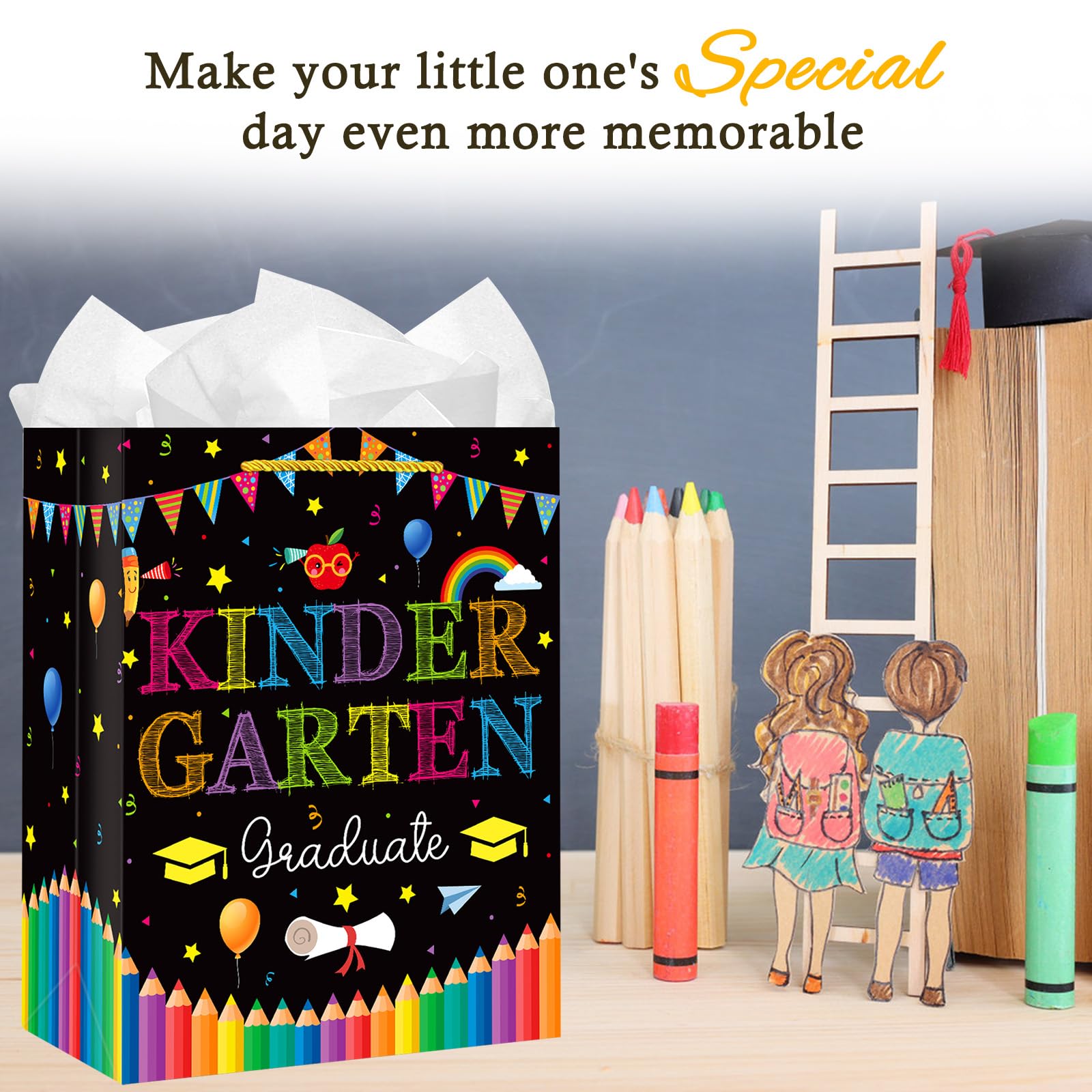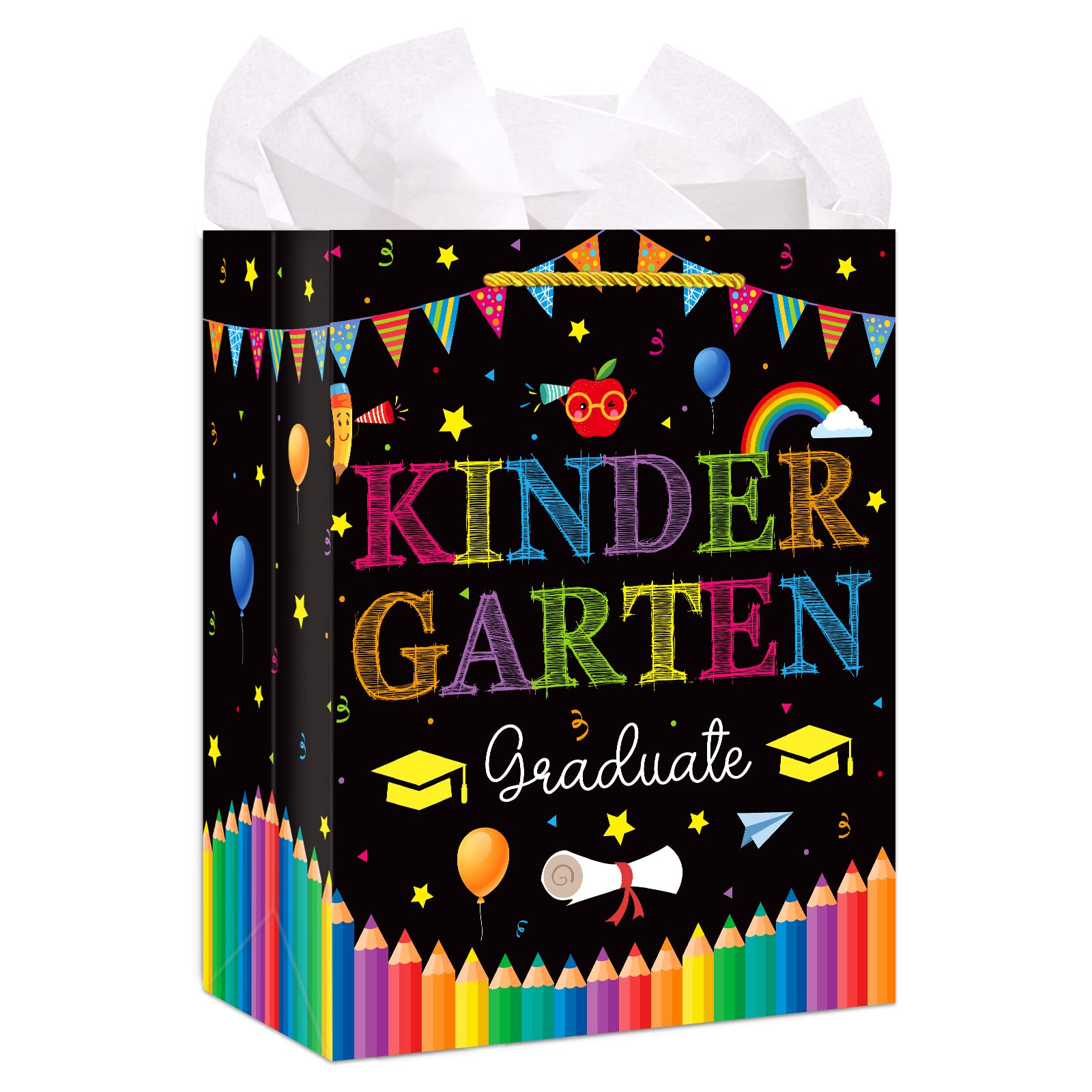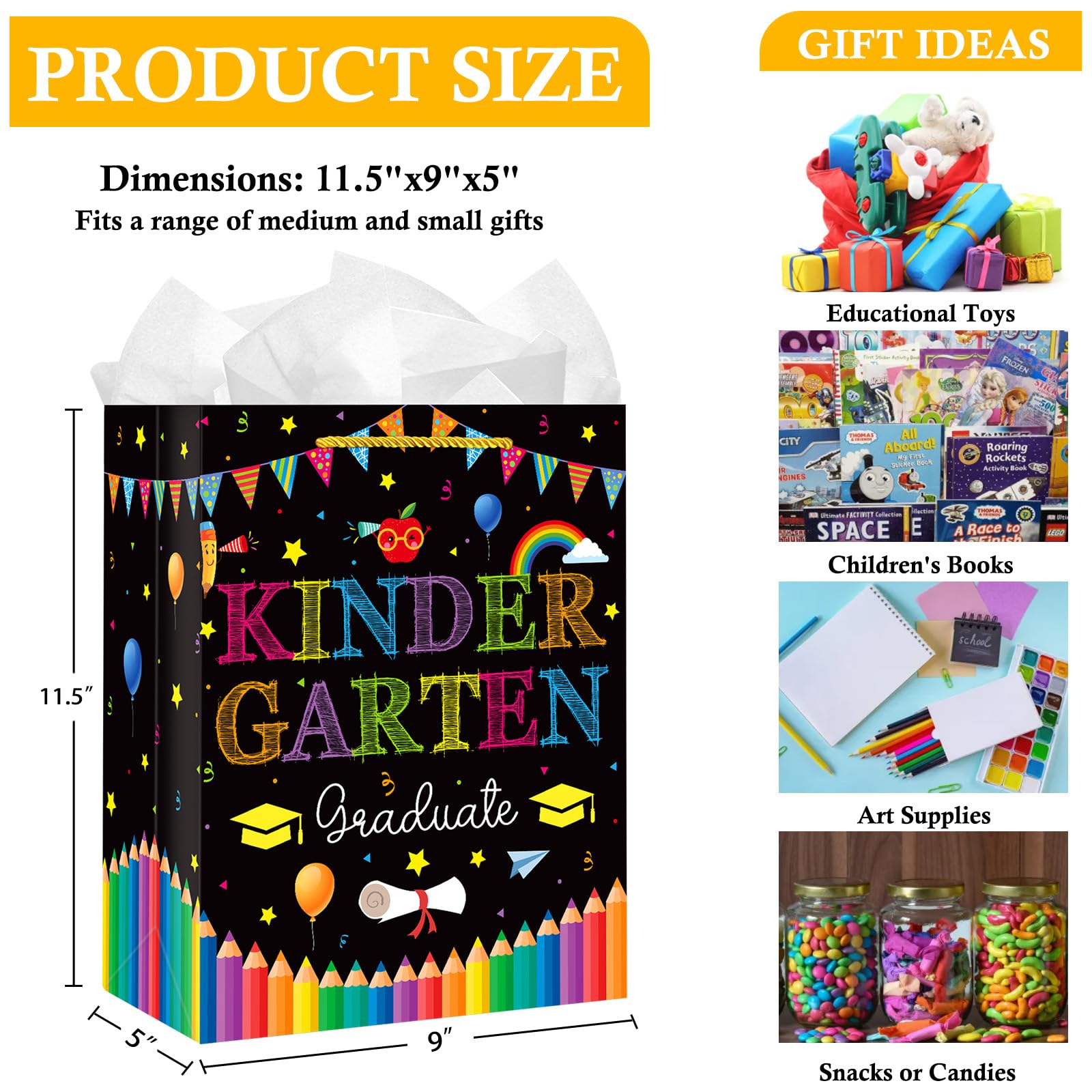【Ideal Medium Size with Elegant Presentation】: The kindergarten graduation paper gift bags measure 11.5"x9"x5", these medium-sized bags fit a variety of gifts and come with white tissue paper to enhance presentation and elevate the gifting experience.