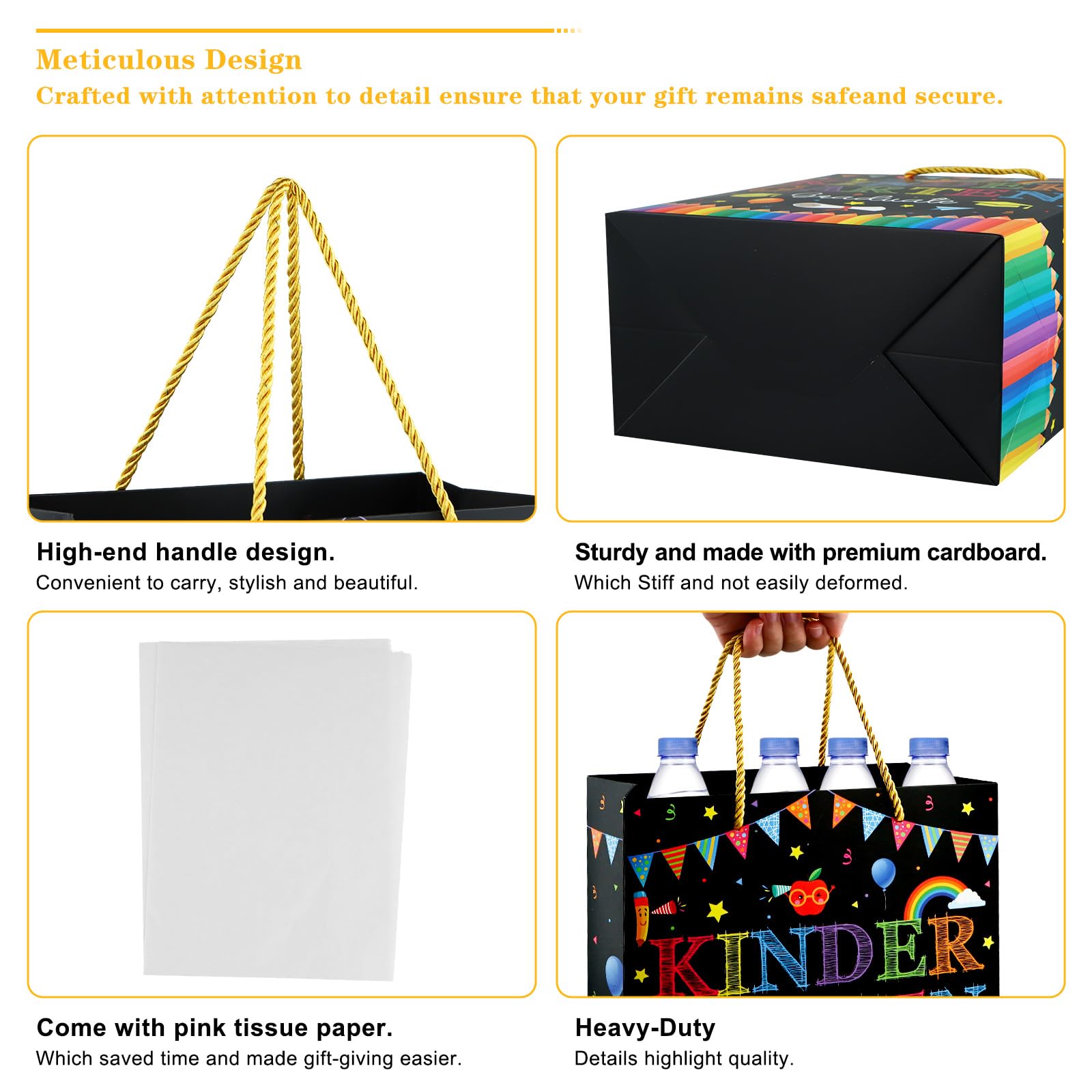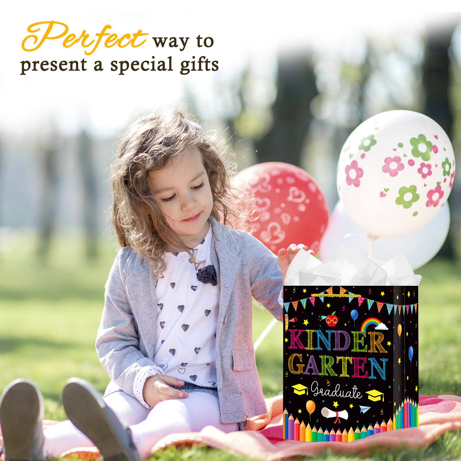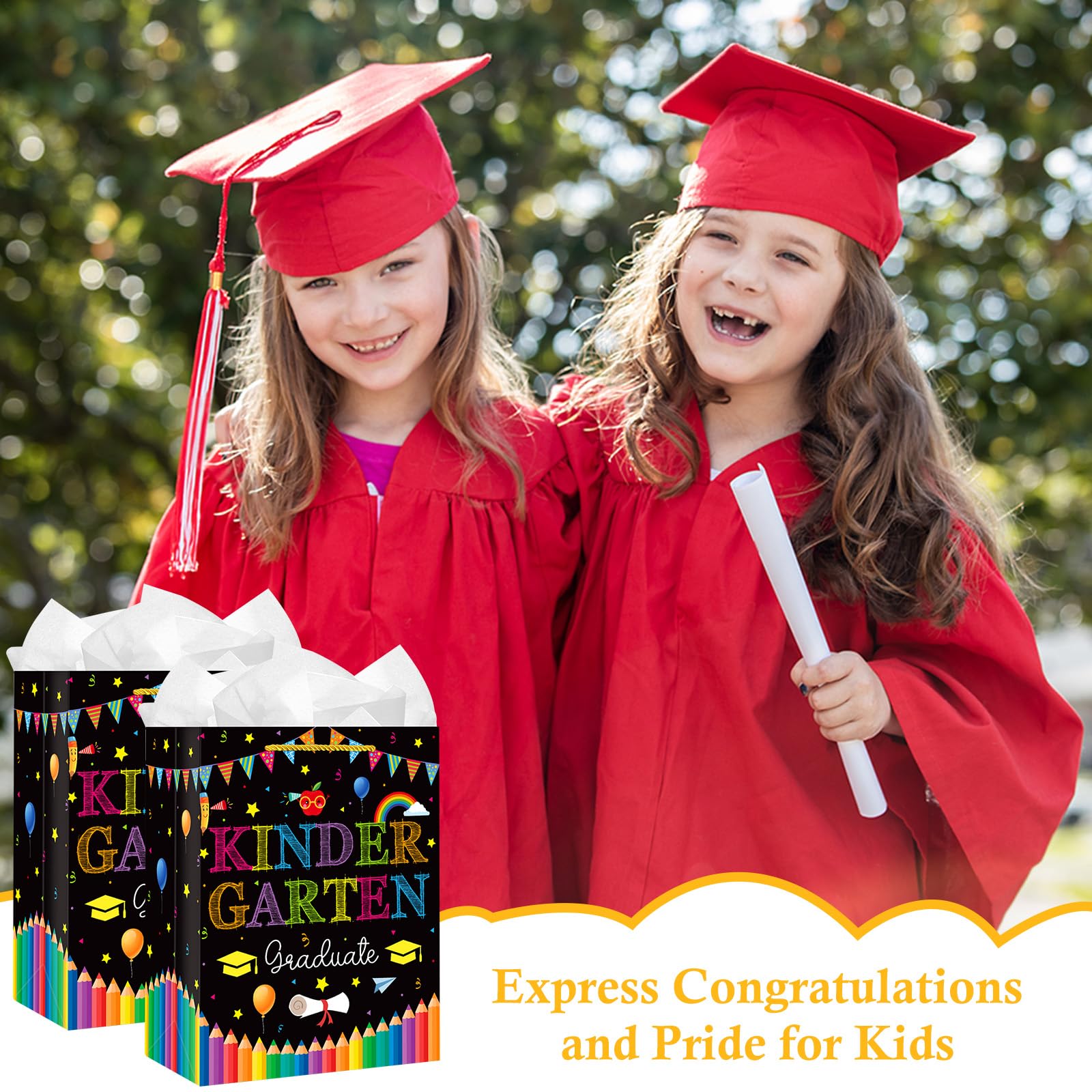 【Ideal Medium Size with Elegant Presentation】: The kindergarten graduation paper gift bags measure 11.5"x9"x5", these medium-sized bags fit a variety of gifts and come with white tissue paper to enhance presentation and elevate the gifting experience.