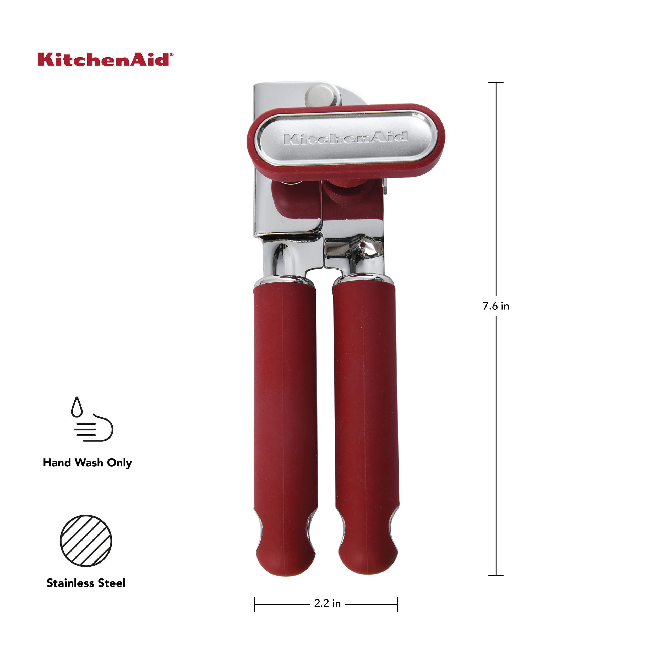 The KitchenAid Silicone Can Opener features a razor-sharp, high-carbon stainless steel blade that easily pierces and slices through any sized can with a smooth, continuous cut. The silicone knob and handles provide optimal comfort and control to help open cans with ease, while the oversized, easy-crank knob allows for effortless opening with just a few turns. This durable tool stands up to daily use. Hand wash with warm water and a mild detergent. Rinse and dry immediately.