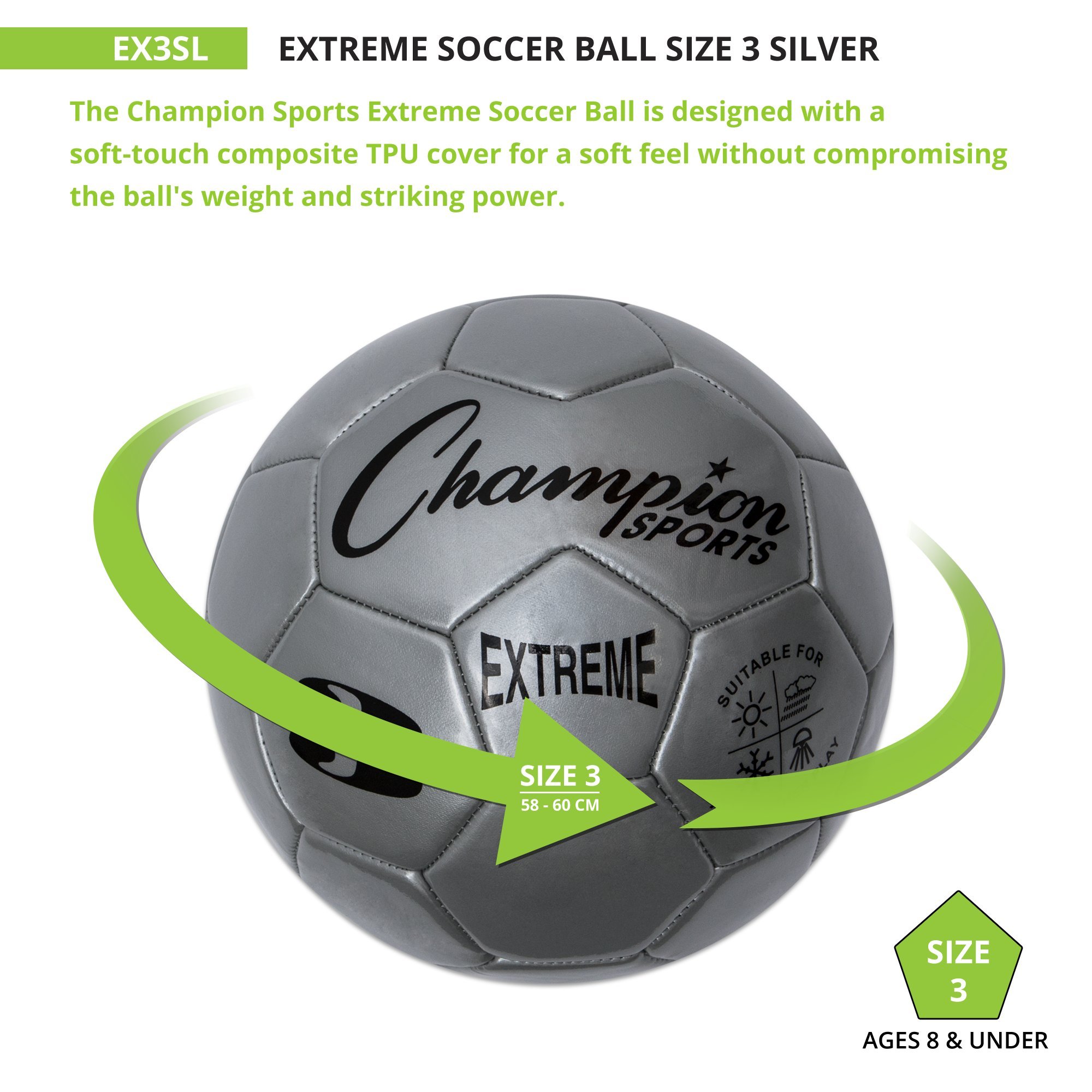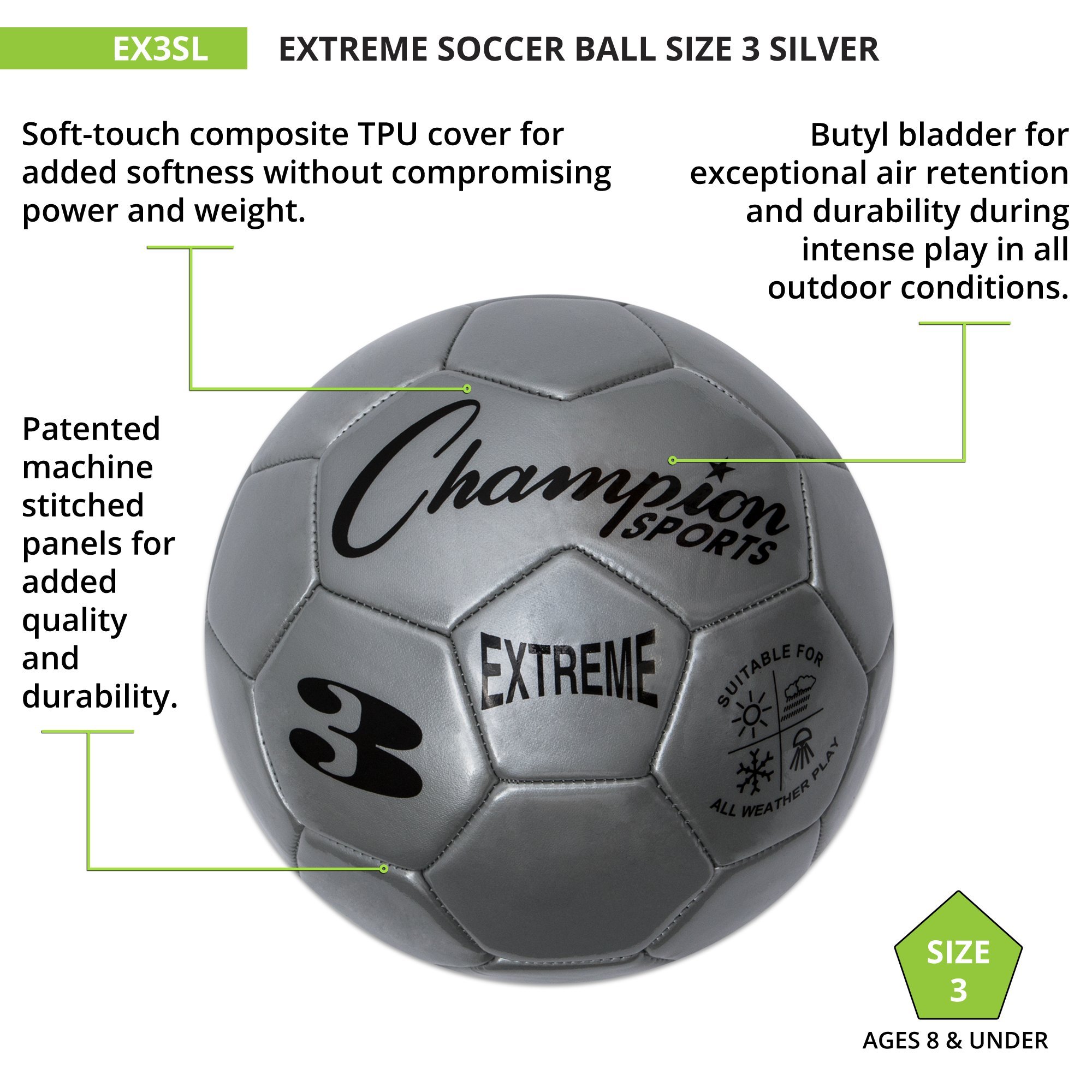 The Champion Sports Extreme Soccer Ball is a Durable, All-Weather Ball for Competition & Training. Built for both competitive matches and casual play, the Champion Sports Extreme Soccer Ball is designed to perform in any weather. Its soft-touch TPU cover provides a comfortable feel for dribbling, passing, and striking, while maintaining the weight and power needed for accurate shots. Engineered for durability, this high-quality soccer ball features a butyl bladder for superior air retention and machine-stitched panels for long-lasting performance. Whether you're playing in the heat, cold, wind, or rain, this ball maintains its shape and reliability. Available in three sizes: EX3 (Size 3): Ages 8 & under, EX4 (Size 4): Ages 8 to 12, and EX5 (Size 5 – Official Size): Ages 12 & up. Choose from a variety of vibrant colors, including Red, Orange, Yellow, Green, Blue, Purple, Black, Silver, and Pink. Note: Ball ships deflated. Pump sold separately.