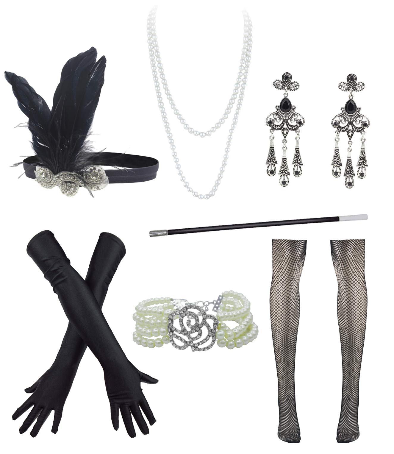 Package:1 x Sequin Dress, 1 x Cigarette Holder, 1 x Long Satin Glove, 1 x Feather Headband, 1 x Pearl Necklace, 1 x Earring, 1 x Pearl Bracelet, 1 x Fishnet stockings