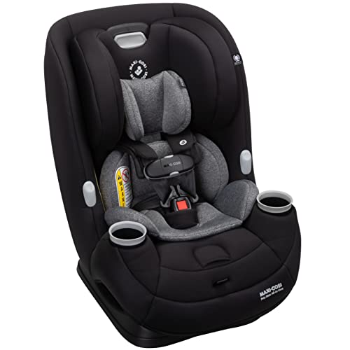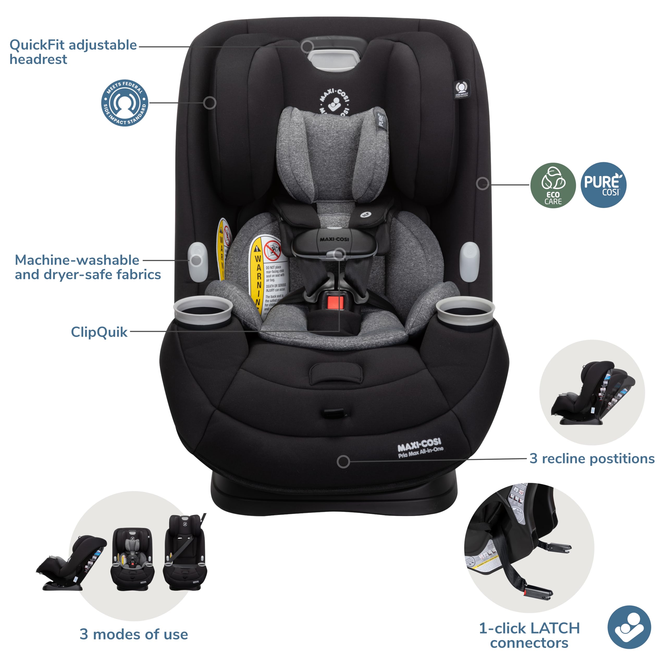 The Maxi-Cosi Pria Max All-in-One Convertible Car Seat is designed to accompany your child from birth to 10 years (4–100 lbs.). This car seat offers flexibility with rear-facing (4–40 lbs., 19"–40"), forward-facing (22–65 lbs., 29"–49"), and belt-positioning booster (40–100 lbs., 43"–52") options. The Pria Max makes securing your child quick and struggle-free with the ClipQuik magnetic chest clip that can be opened with one hand. The Out-of-the-Way spring assist harness system prevents fumbling with straps and buckles. Crafted with PureCosi fabrics, the car seat fabric is free from wool and added fire retardants. The Pria Max features soft, plush fabric, padding, and cushions that can easily be removed for machine washing and drying. Installation is straightforward with one-click LATCH connectors, making the process hassle-free. From your newborn's first ride home to your big kid's school drop-off, the Maxi-Cosi Pria Max All-in-One Convertible Car Seat is a reliable, comfortable choice for modern families. Proudly made in Columbus, Indiana.