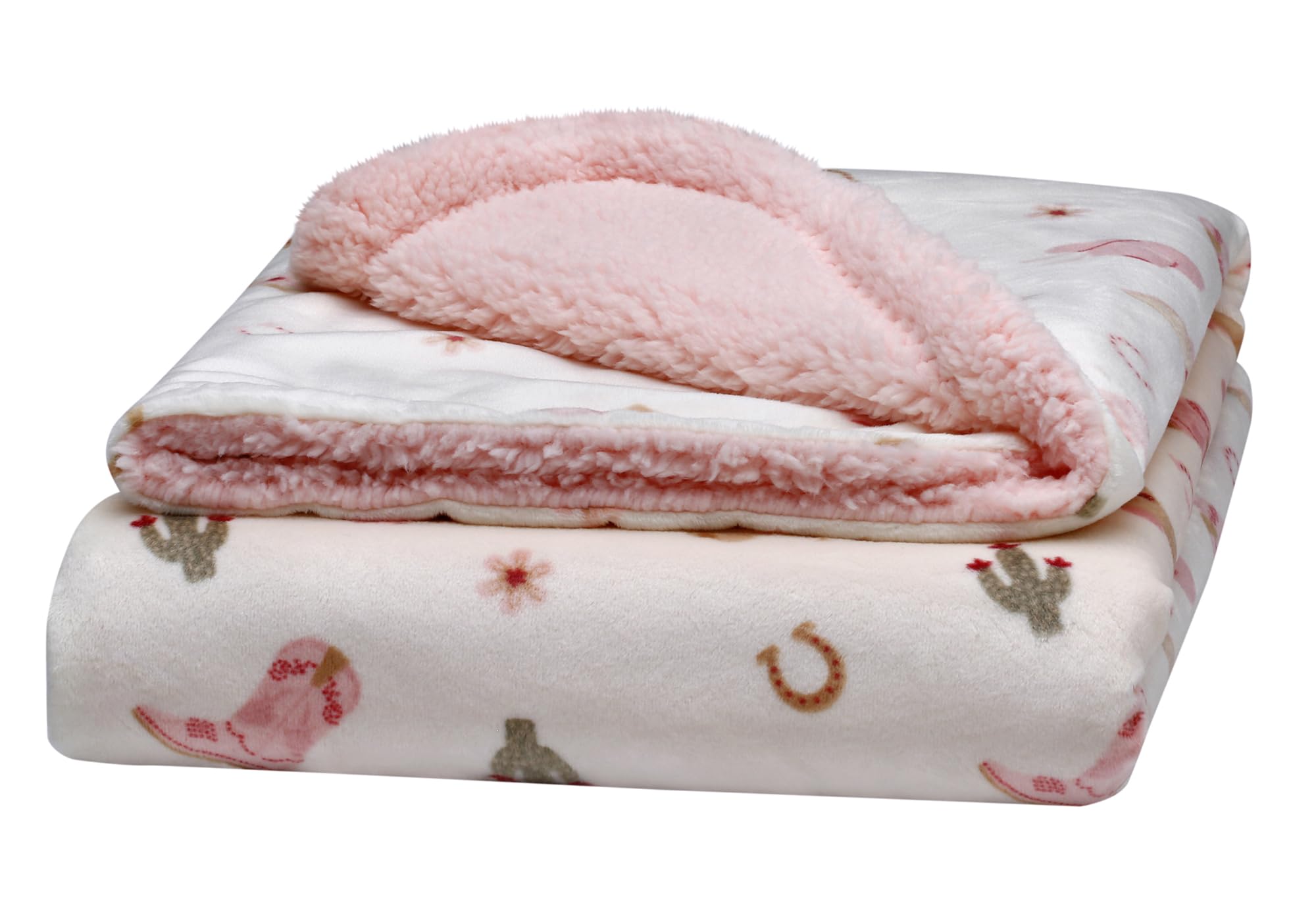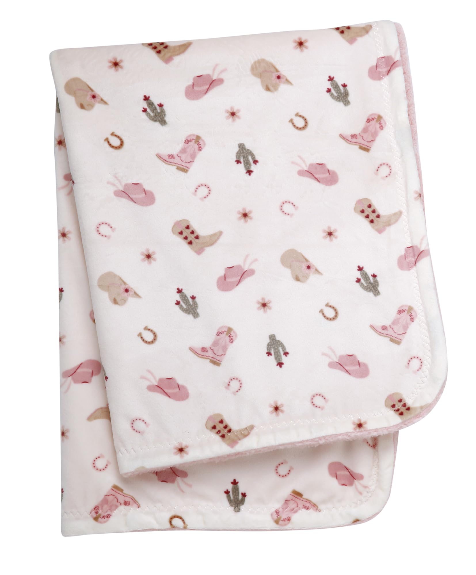 Soft and cuddly, this silky soft baby blanket (30 in x40 in) is the perfect for a new baby and parents. The soft, double layer reversible blanket is printed on one side and a solid color on the reverse. The western ranch design is accented with cowboy hats, boots, horseshoes and pink on the reverse. The 2 ply blanket is great for snuggling and tummy time at home or while traveling with baby.