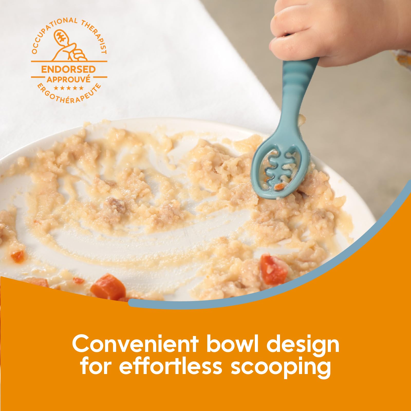 EASY SELF-FEEDING FOR THE FIRST STAGE Make the starting solids transition easier (and more fun) for baby. Each set comes with a pre-spoon perfect for purees, doubling as a teether for sore gums, along with an open-channel spoon designed to grip soft solids. These spoons help teach the skills and motions needed to graduate to a traditional spoon, without requiring wrist rotation to use, a skill children typically do not develop until 2 years old. Caregivers love how these spoons reduce mealtime mess and frustration.