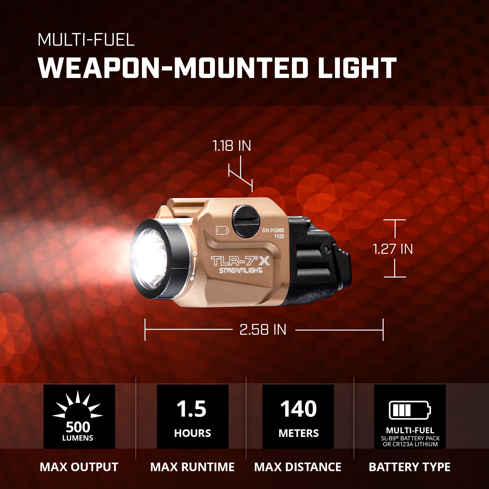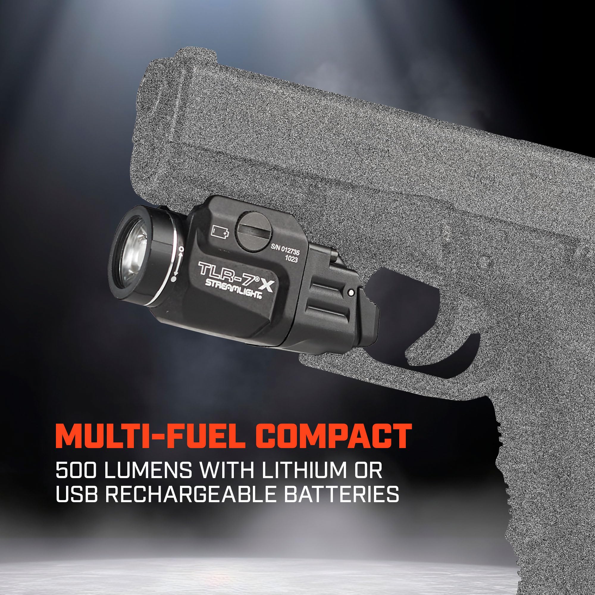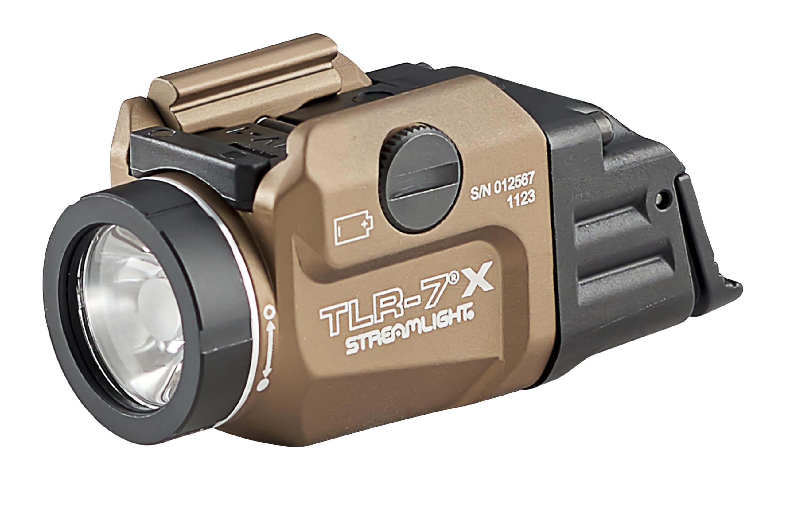 The Streamlight TLR-7 X features multi-fuel capability powered by either one (1) CR123A or one (1) Streamlight SL-B9 lithium-ion rechargeable battery pack, (sold separately), both delivering 500 Lumens and 5,000 Candela. The integrated rail clamp is designed to rapidly attach/detach from the side of the weapon, providing smooth installation and removal without having to put your hands in front of the muzzle. Customizable rear paddle switches, momentary and constant on operation, and a programmable strobe mode offer additional versatility for many tactical applications.