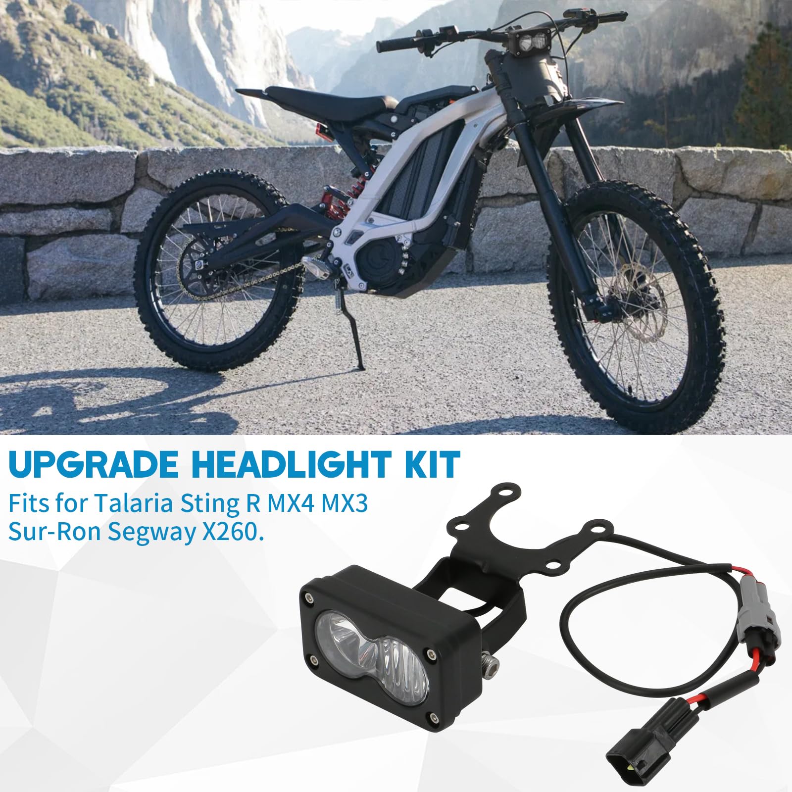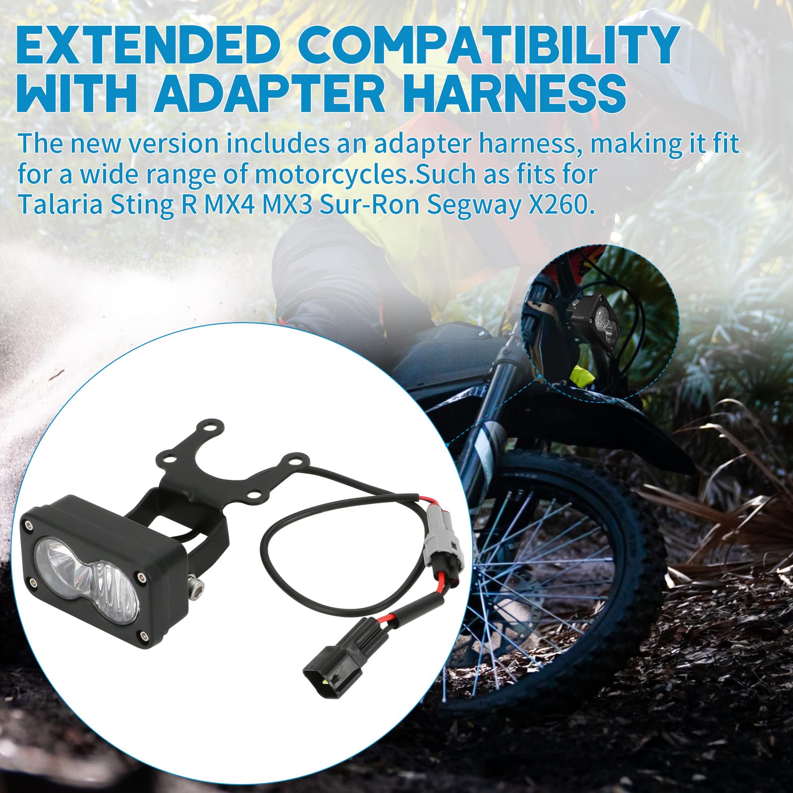 【Extended Compatibility with Adapter Harness】The new version includes an adapter harness, making it fit for a wide range of motorcycles.Such as fits for Talaria Sting R MX4 MX3 Sur-Ron Segway X260. A versatile lighting solution for riders with multiple bikes or those upgrading their current setup.