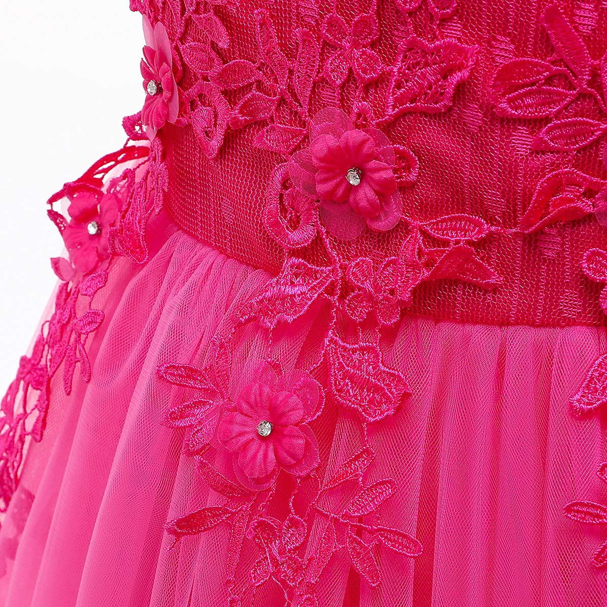 Mesh spliced bodies with soft lining, adds ruffled tulle details at sleeve, tops embellished with beautiful flower, faux rhinestone and embroidered patchwork at front,Designed with concealed zip-back fastening, the sashes are attached at the side seams and can be tied a bowknot at back.This dress contains 2 layers tulle, 2 layers soft lining, and 2 layer netting attached on the innermost fabric adds to a fuller look
