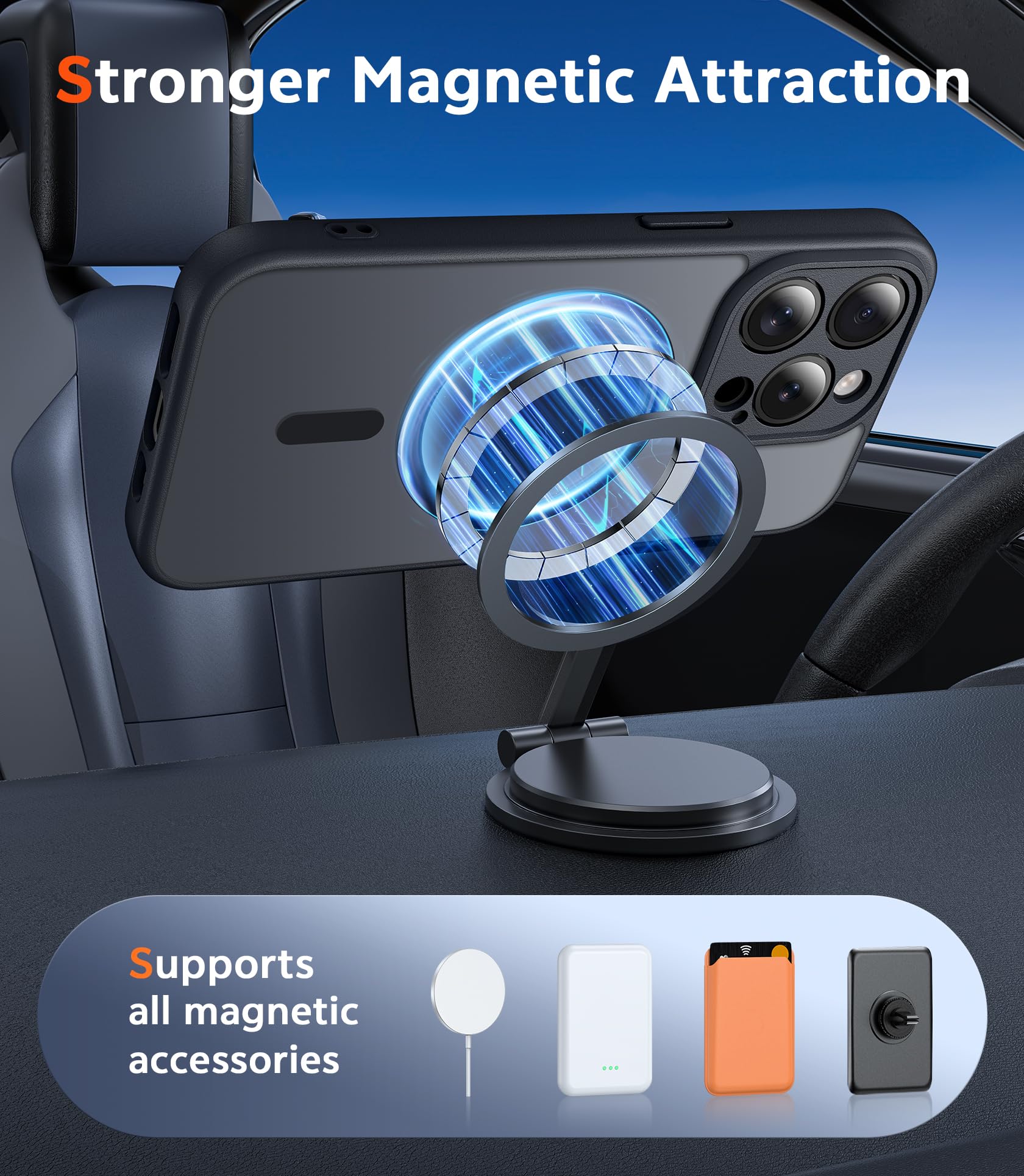 Strong Magnetic Charging: Fit for Magnetic chargers and other Wireless chargers. This iPhone 15 Pro Case has built-in 38 super N52 magnets. Its magnetic attraction reaches 2400 gf, which is almost 7X stronger than ordinary, therefore it won't fall off no matter how it shakes when you are charging. Aligns perfectly with wireless power bank, wallets, car mounts and wireless charging stand