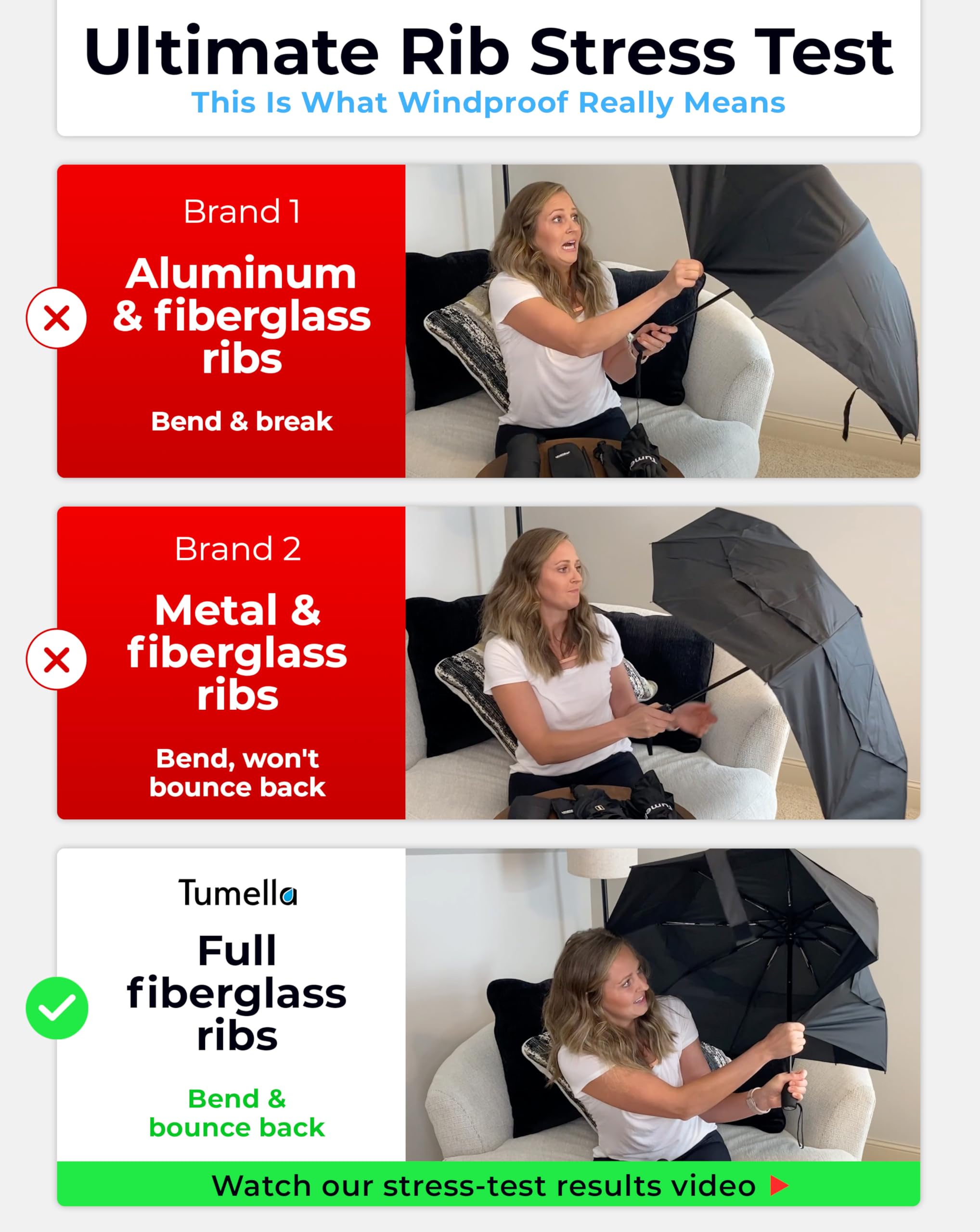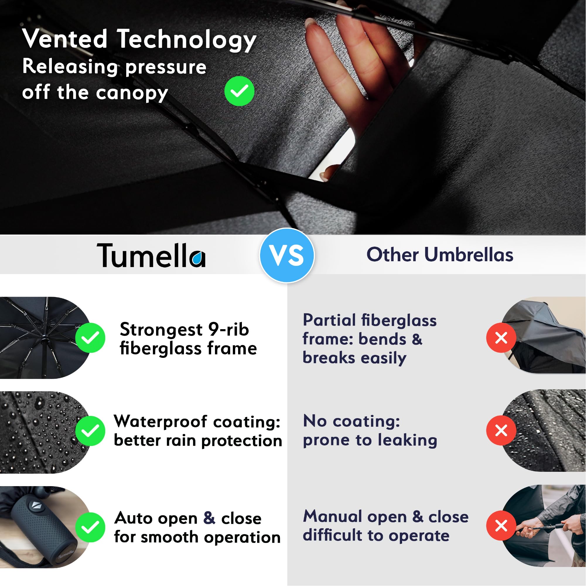 UPGRADED & UNMATCHED WIND AND WATER PROTECTION: Waterproof coating shields you from bad weather. We added a vented double canopy that allows wind to pass through, to securely and conveniently withstand even the harshest weather. Unlike other umbrellas with partial fiberglass ribs, our full fiberglass ribs may bend but will easily bounce back in shape, without breaking (aluminum) or bending (metal).