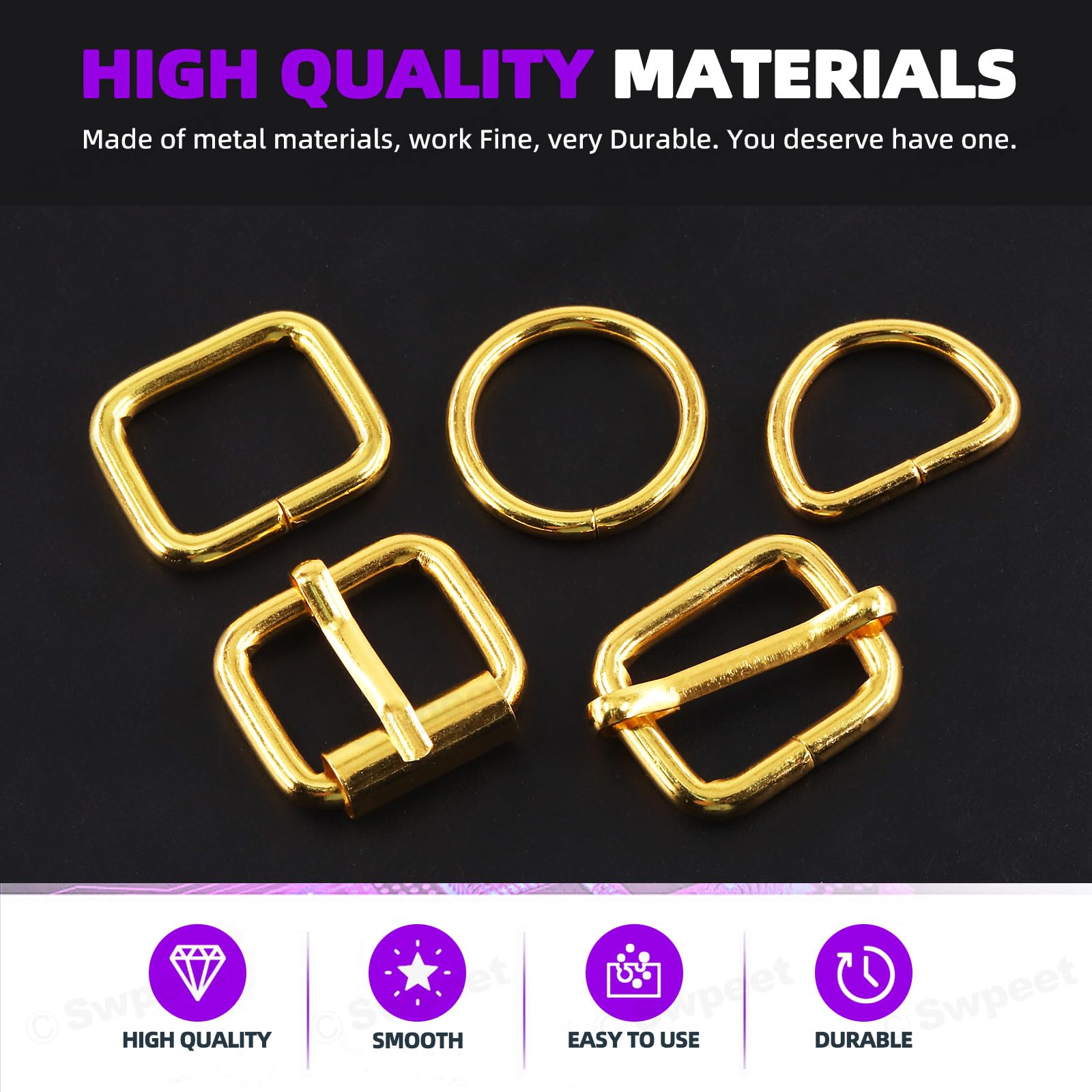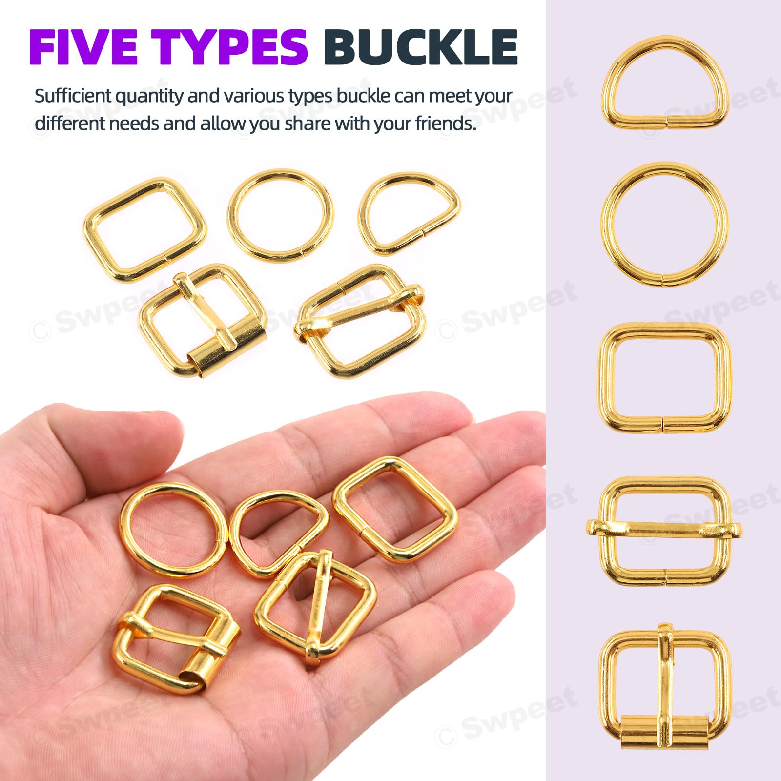 💯 【What You Get】------ In this kit, you will get 50pcs metal buckles assortment kit. Including 10pcs gold metal roller buckles, 10pcs gold metal adjustable slide buckles, 10pcs gold D ring, 10pcs gold circular ring, 10pcs gold square ring. Each of the metal buckles are both approx 3/4 inch. We provide you with various shapes of metal buckles to choose from, meeting your diverse daily DIY needs.