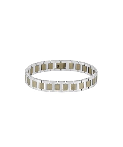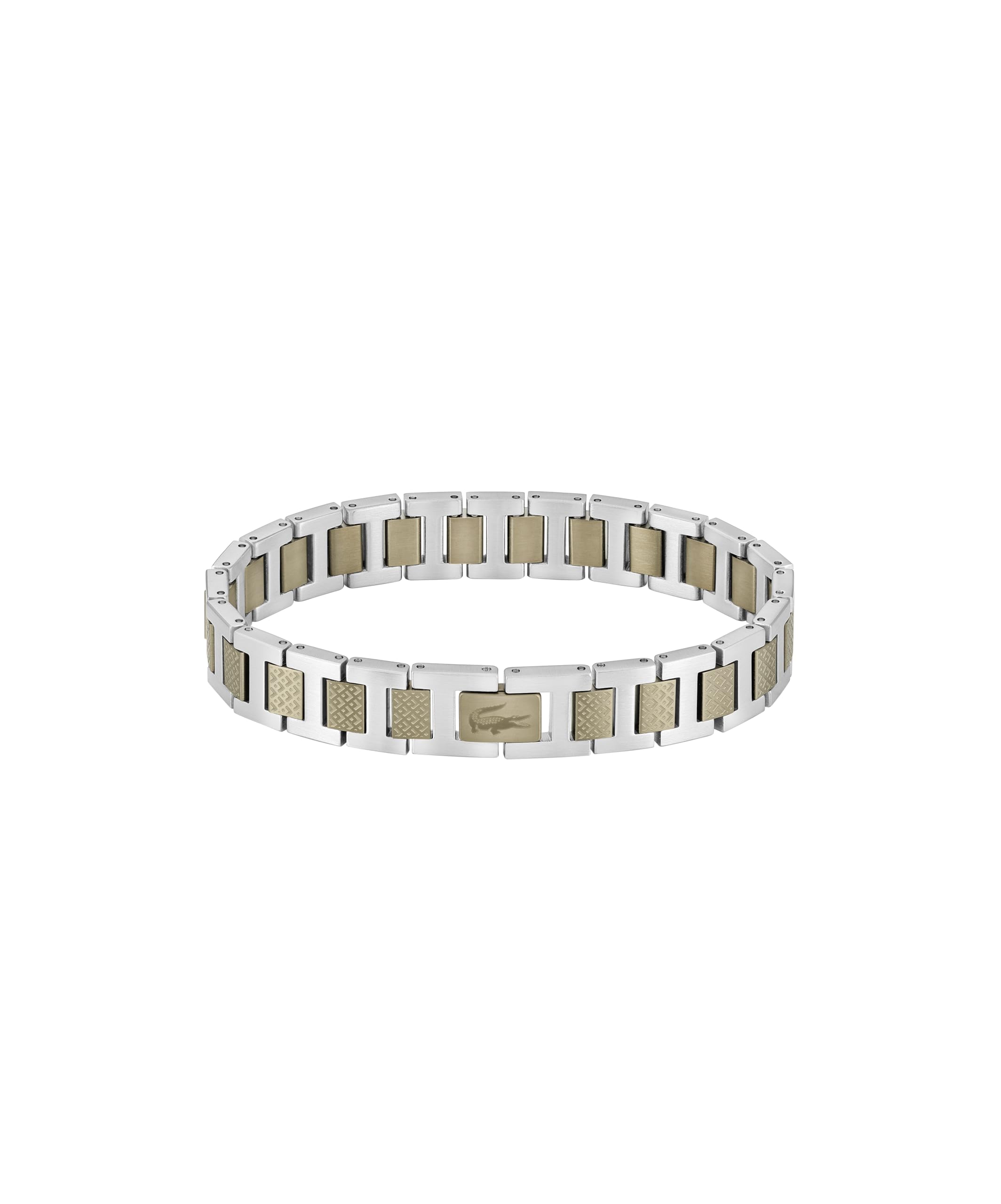 The Metropole bracelet features elegant H-links with petit piqué center links, an etched croc clasp, and contrasting polished and etched finishes. Adjustable, available in monochrome or two-tone colorways.