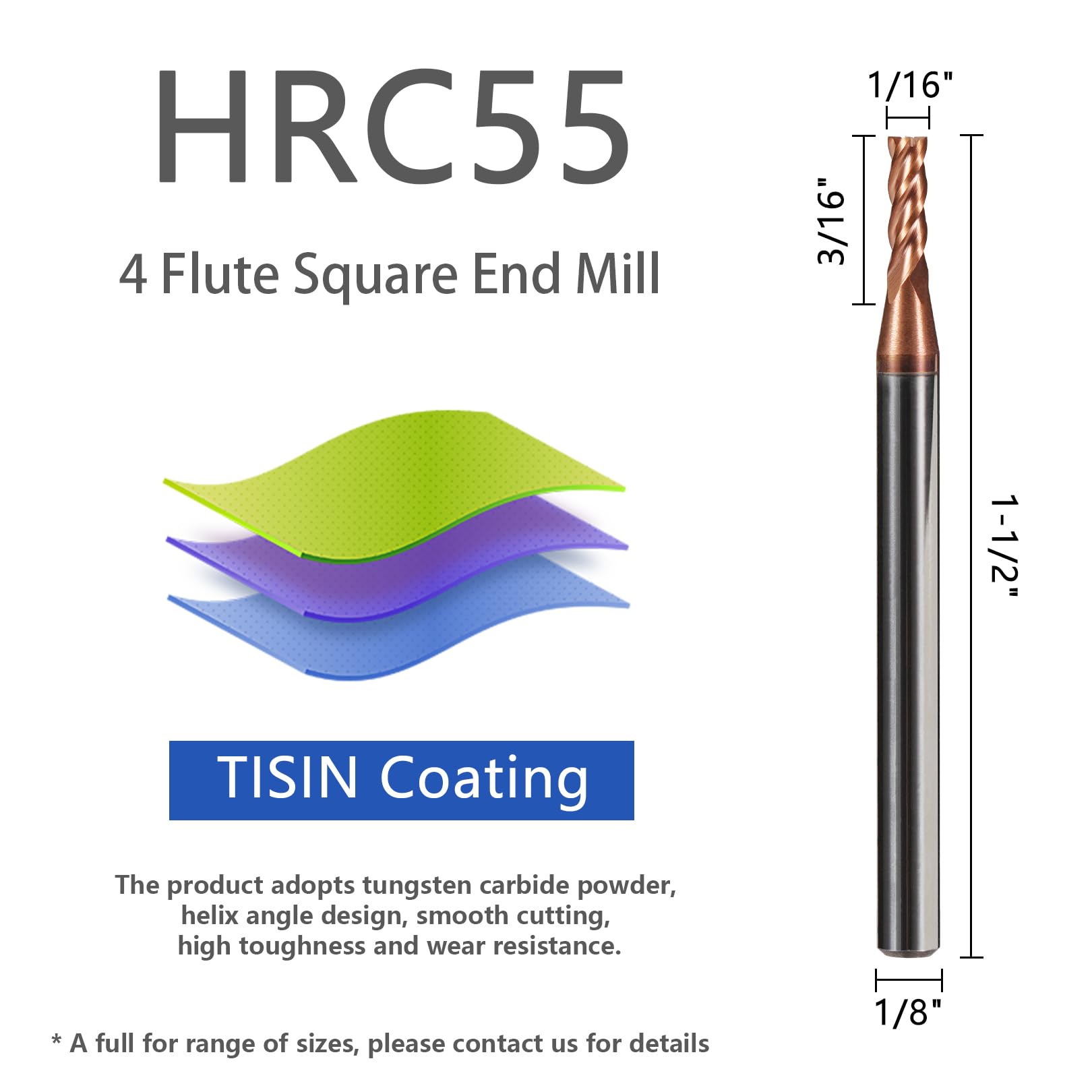 Package Included: 5pcs square nose end mills, each is individually packed in a plastic storage box. Cutting diameter: 1/16inch; Shank diameter: 1/8inch ; Flute cutting length: 3/16Inch; Overall length: 1-1/2 Inch.