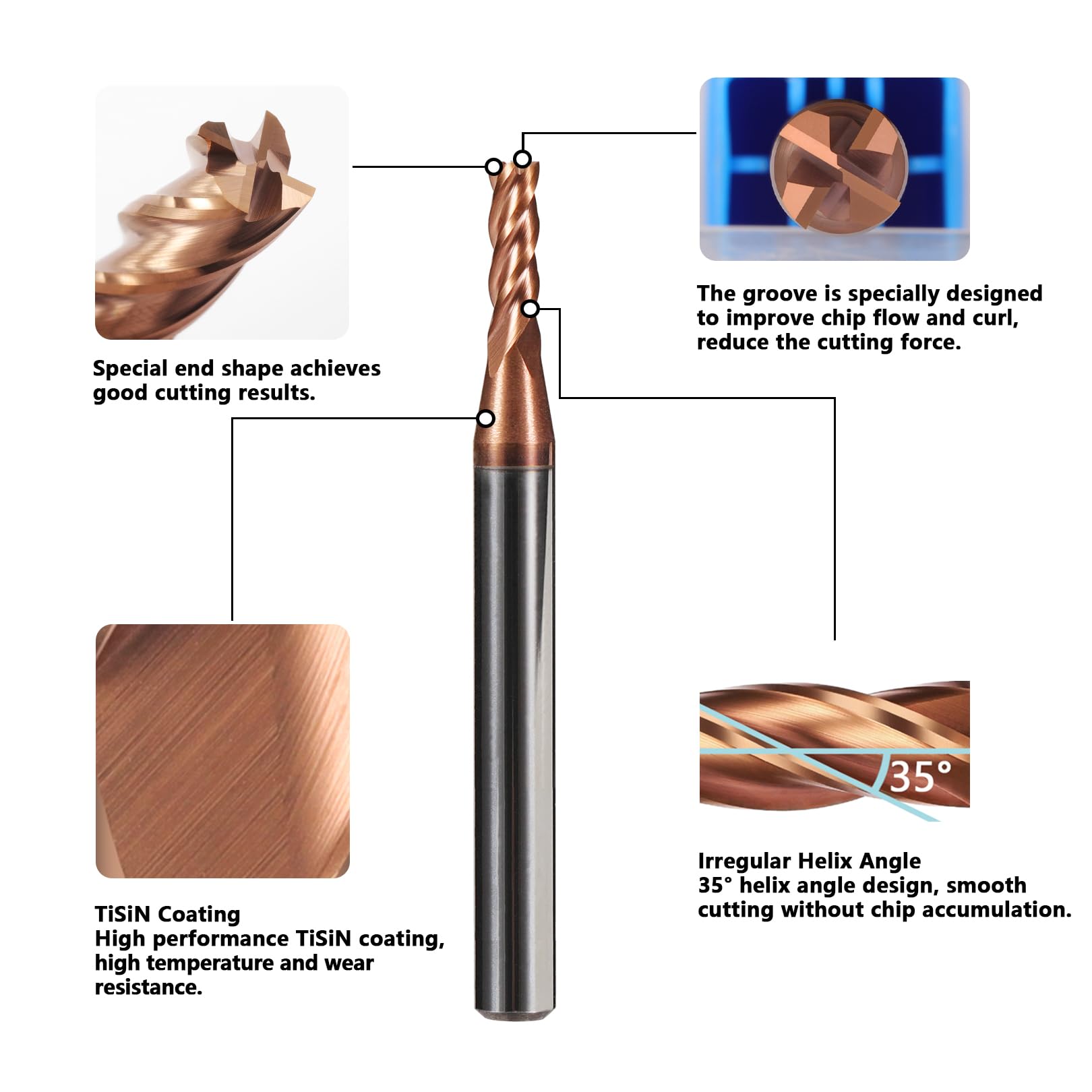 Ultra-Precise Micrograin Carbide Structure—— Featuring 0.6μm micrograin tungsten carbide, it is high-wearable and has a long life; 4 flutes 35° helix angle design,great for speedy cutting smooth cutting and fast chip-removal, gives outstanding cutting performance and wear resistance.
