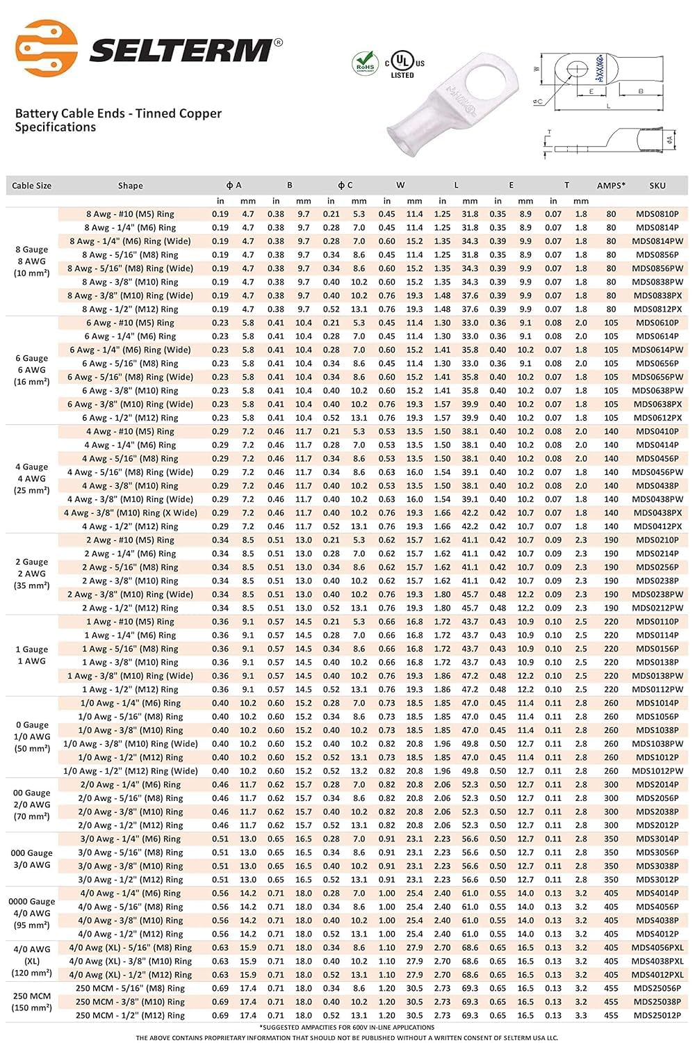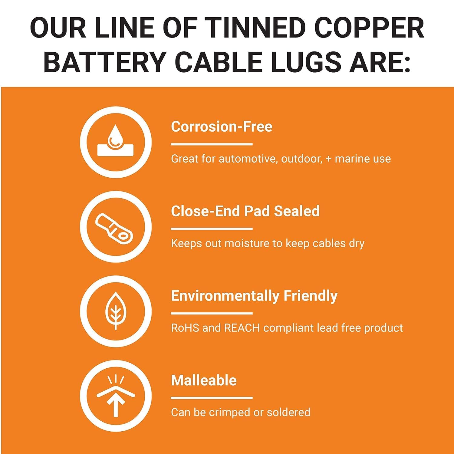 Secure and Reliable Connections: Ensure strong and dependable battery connections with Selterm 3/0 AwgAWG Ring Terminal Connectors. Approved by OEMs, our Tinned Copper wire ring connectors are corrosion free; ideal for marine, automotive or outdoor use; salt spray tested to ASTMB117 standard. Special matte tin plating make these lugs as easy to Solder as it is to Crimp.