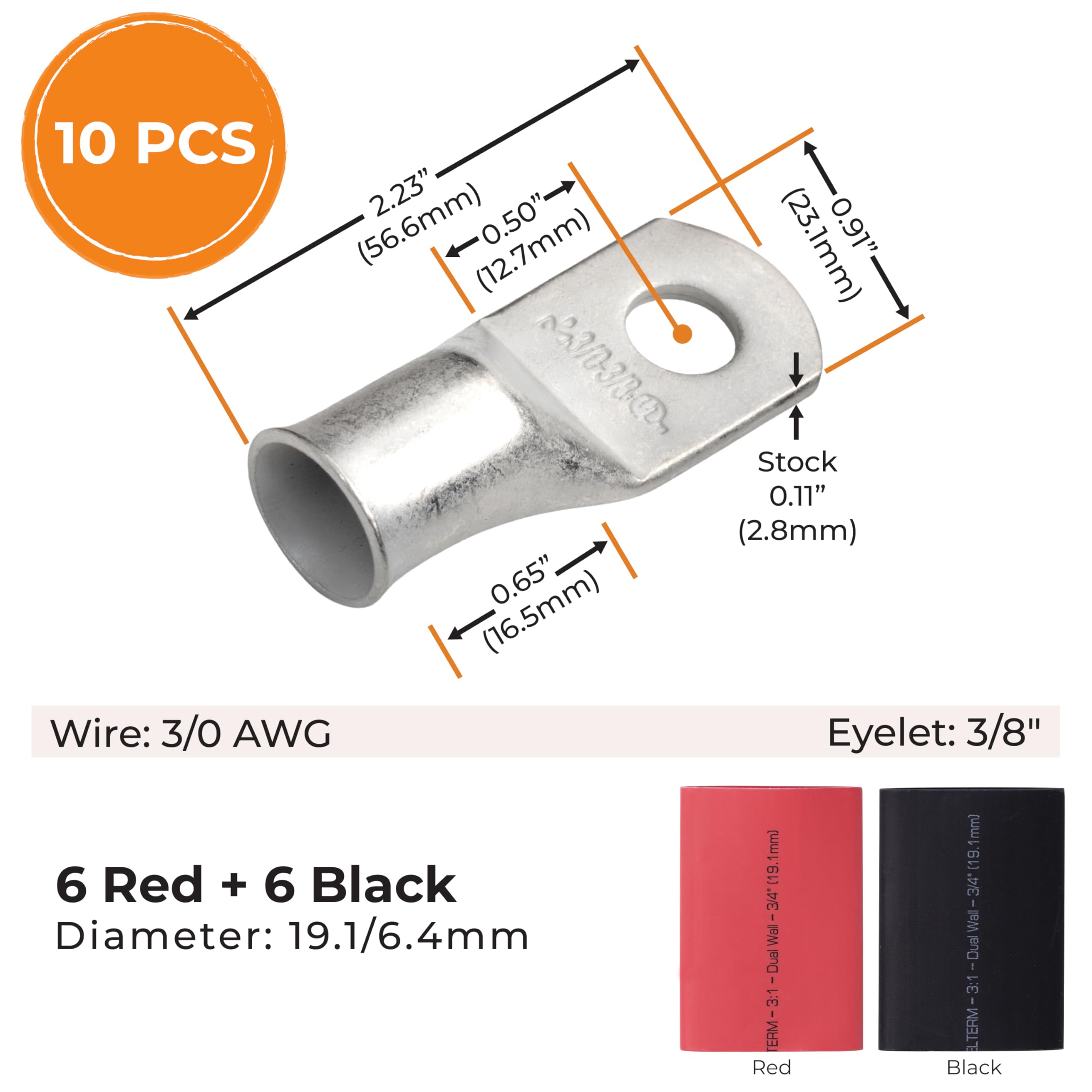 Package Contains: Each purchase includes 10pcs 3/0 AWG - 3/8" Stud Battery Lugs Ring Terminal Connectors, along with 12pcs 3:1 Black & Red Heat Shrink Tubing with Adhesive. This comprehensive kit provides all the essentials for maintaining efficient and lasting battery connections.