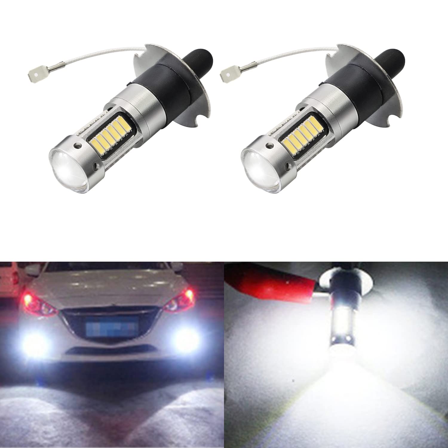 【3600 Lumens Bright Output】 Extremely Bright! 2 Pcs high illumination and high power 4014 LED chips offer total 3600 lumens of H3 LED fog bulbs with 360-degree lighting angle, bright and safe. Only 1/3 power consumption of halogen bulb but 3 times brighter. Voltage: DC 12V, Color: 8000K White.