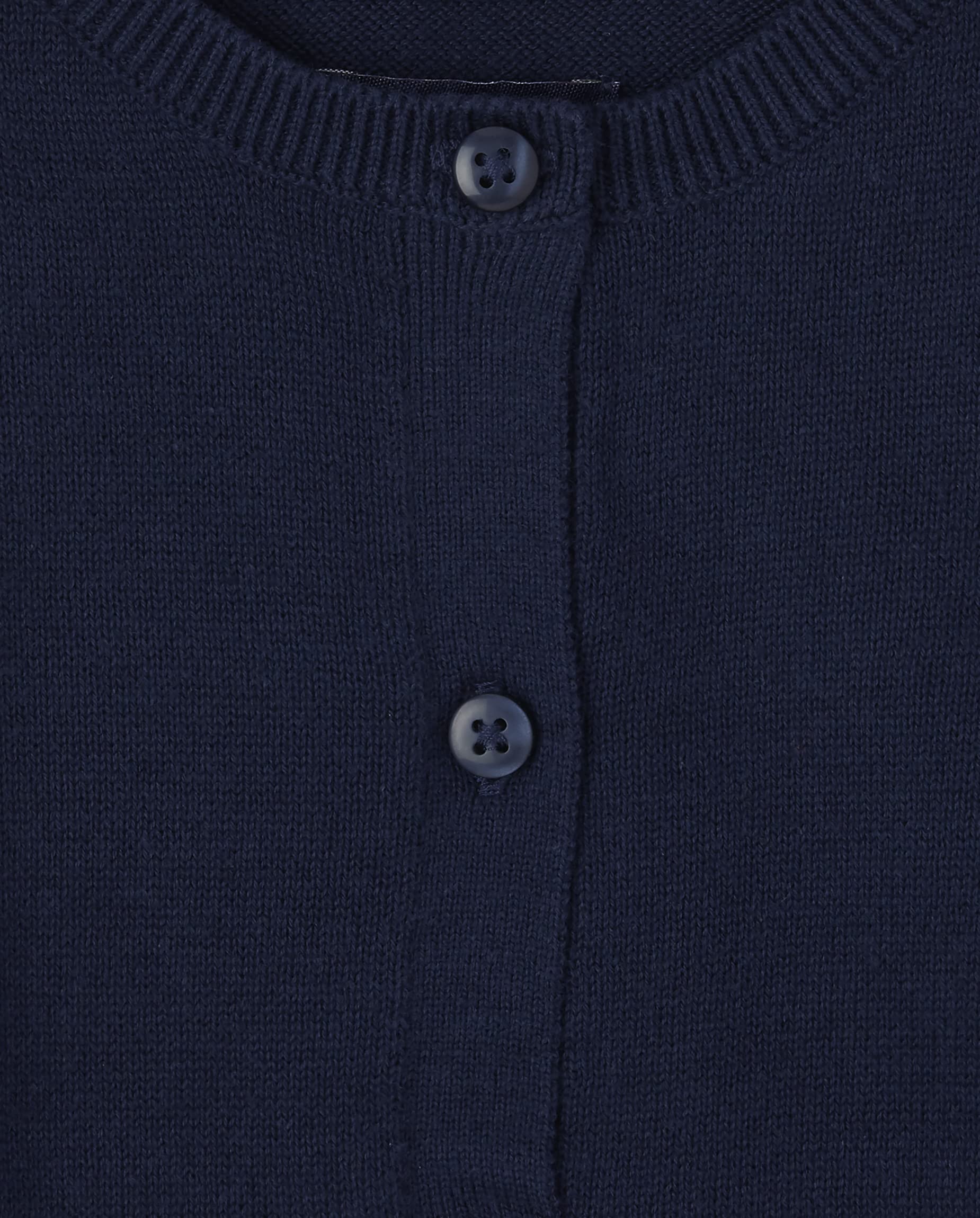 A closet staple with a ltitle flair, this crew neck cardigan is the ideal bring-along look; pairs well with dresses, skirts and pants
