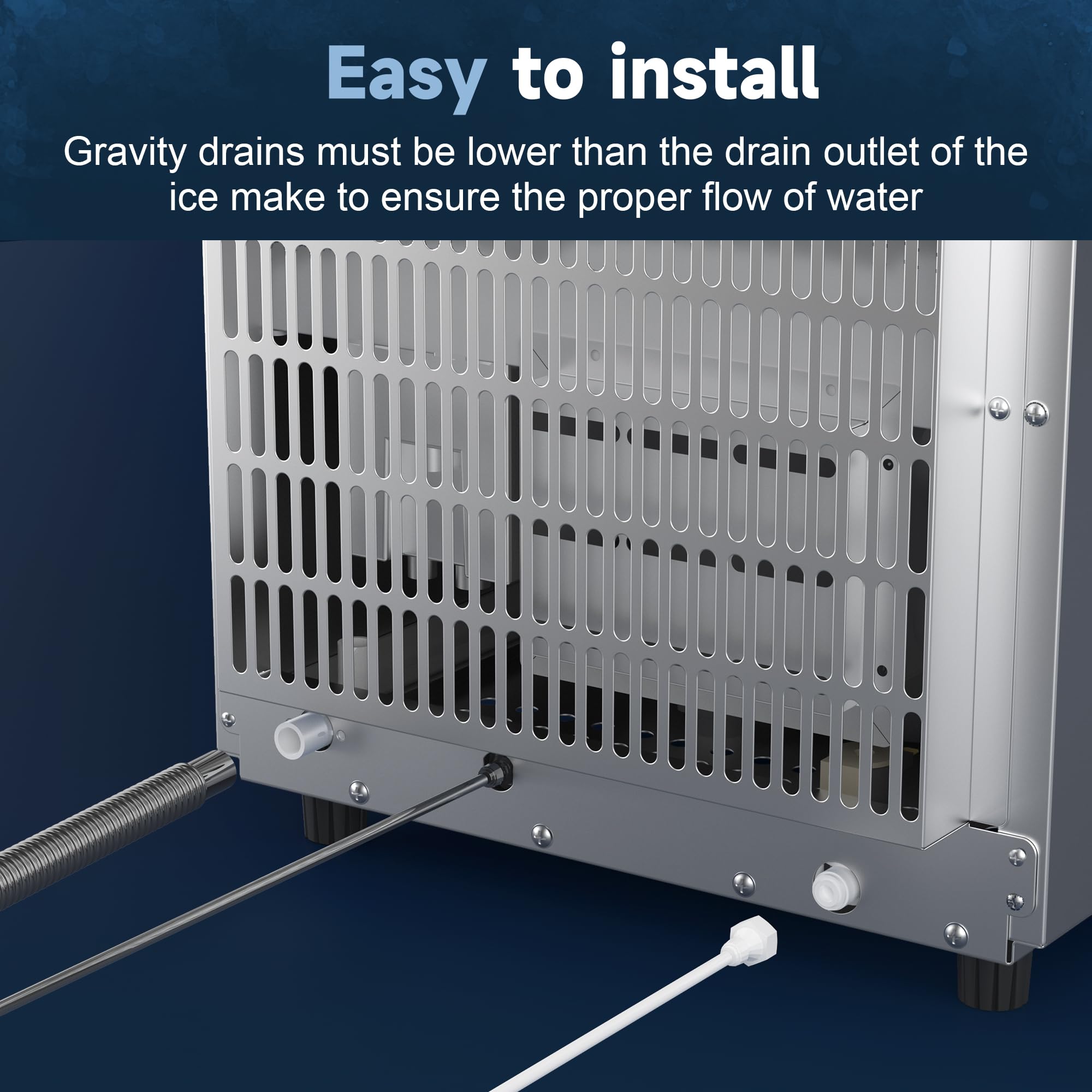 Direct Drainage, No Leaking: A gravity drain.Your selection of one will be based on the installation location. You’ll need to connect the water line to the kitchen water supply and run the drain hose into the floor drain before plugging the machine in. If you need to use an external pump to drain water, please purchase the pump yourself and make sure the pump is below the floor level of the ice machine.
