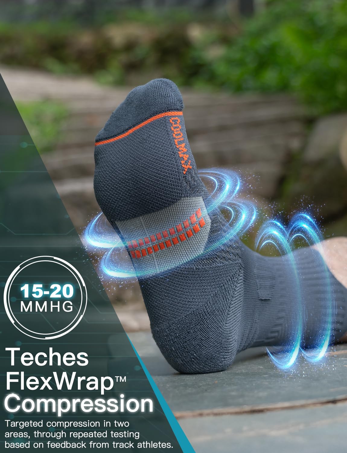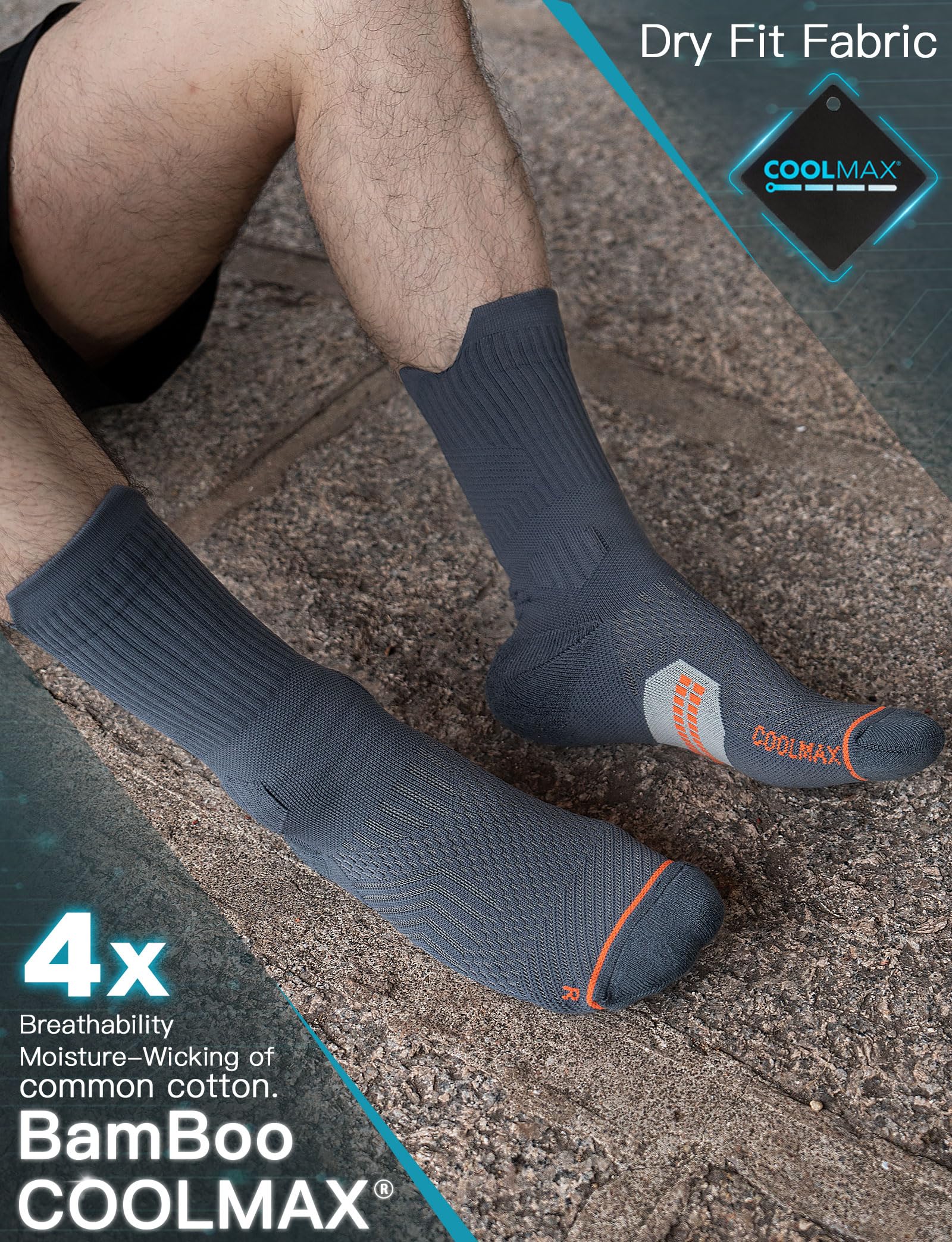 【Advanced COOLMAX & Organic Bamboo viscose Blend】: Keep your feet dry and fresh with our running socks! The COOLMAX fabric quickly wicks away sweat, while organic bamboo viscose helps minimize odors and keeps your socks feeling clean. Enjoy superior comfort and freshness with this innovative sock technology!