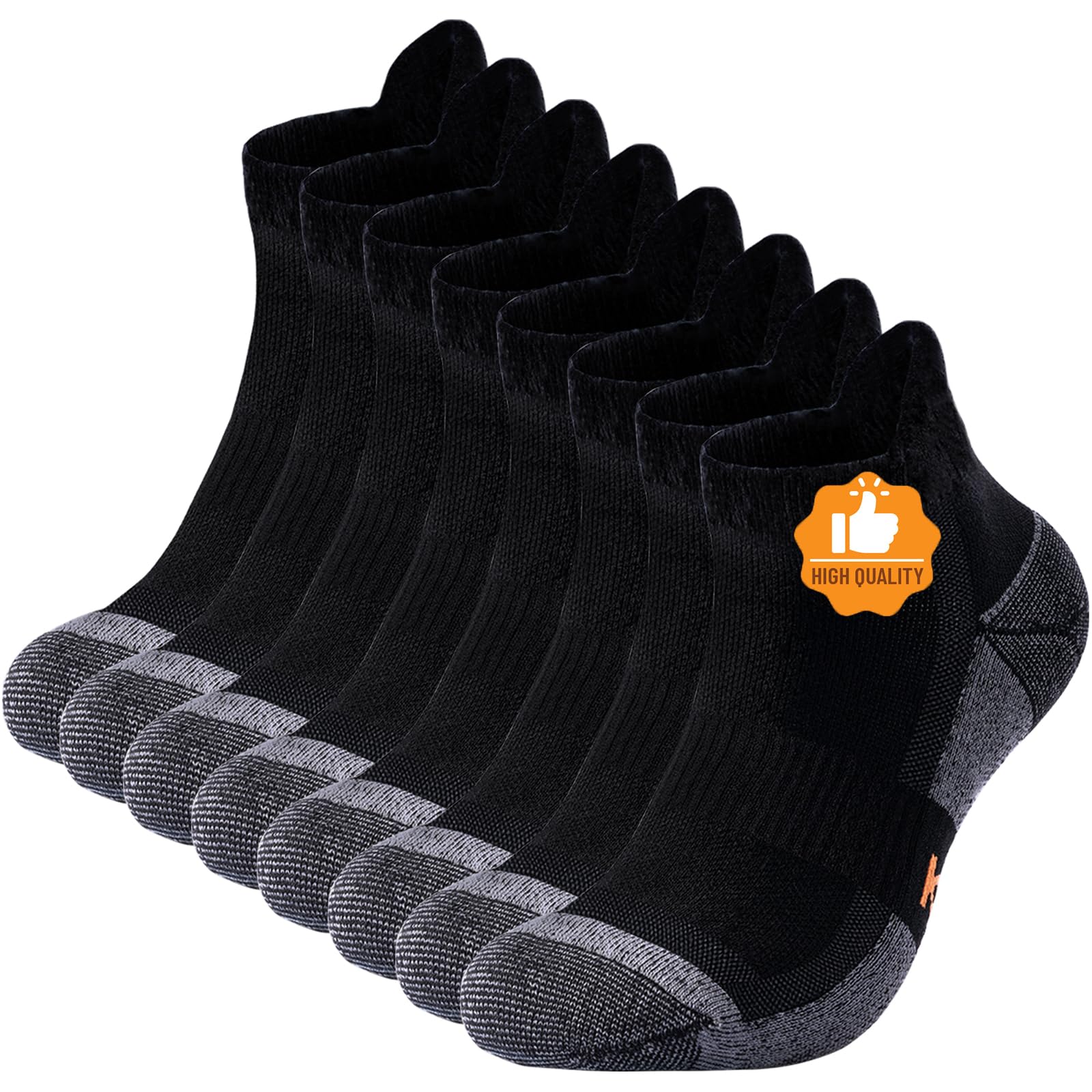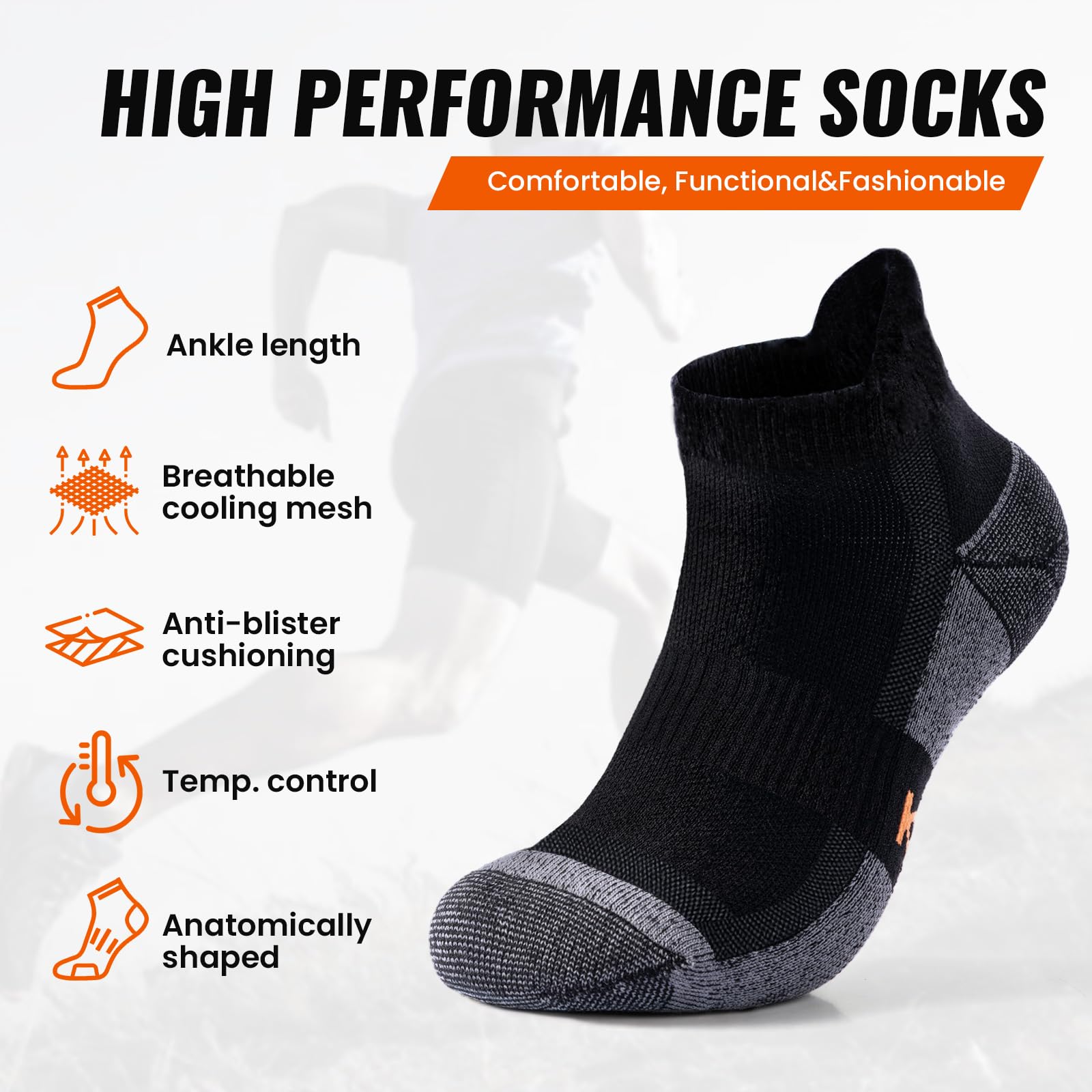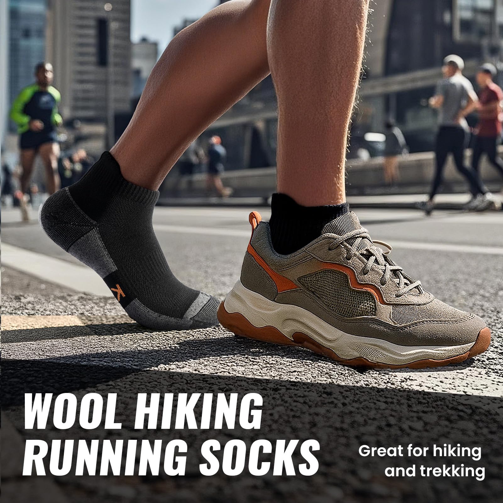 PROTECTION FOR FEET - These mens wool running ankle socks have stretchy cuff and arch support, which can have great compression support to reduce fatigue, protect the Achilles tendon, promote comfort during prolonged wear, and keep socks fit snugly. Cushioned sole absorbs shock and helps minimize blister risks during 10km+ hikes. Pull tab resist abrasion and prevent slipping. All of these provide more protection for your feet.