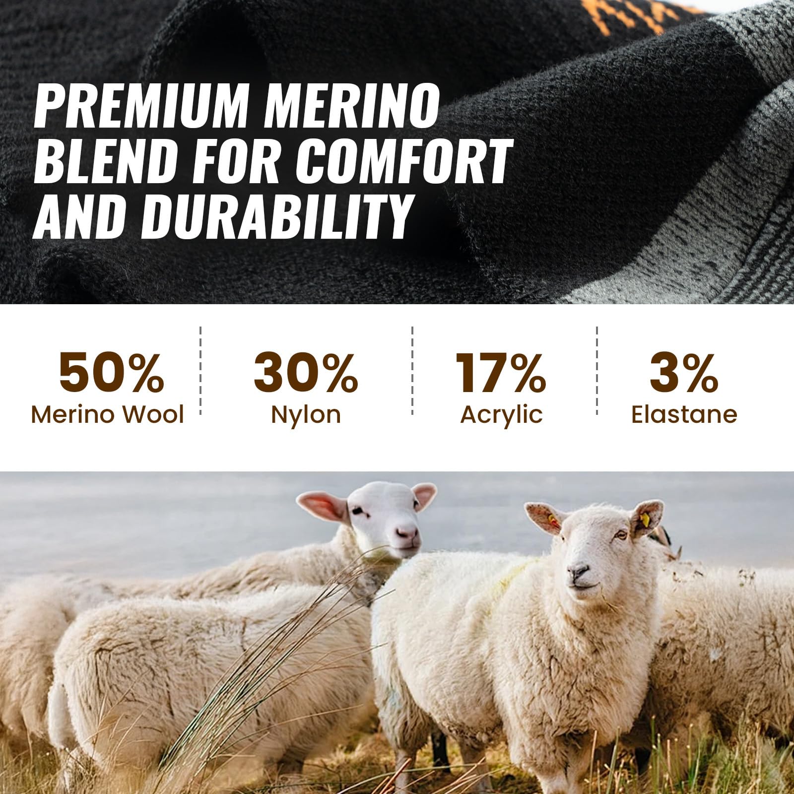 COMPOSITION - KACIIXAA hiking socks are made of 50% Superfine Merino Wool, 30% Nylon, 17% Acrylic, 3% Elastane, which are wearable and durable. Merino wool's natural thermoregulation adapts to and keep you warm, so you can wear them in different season.