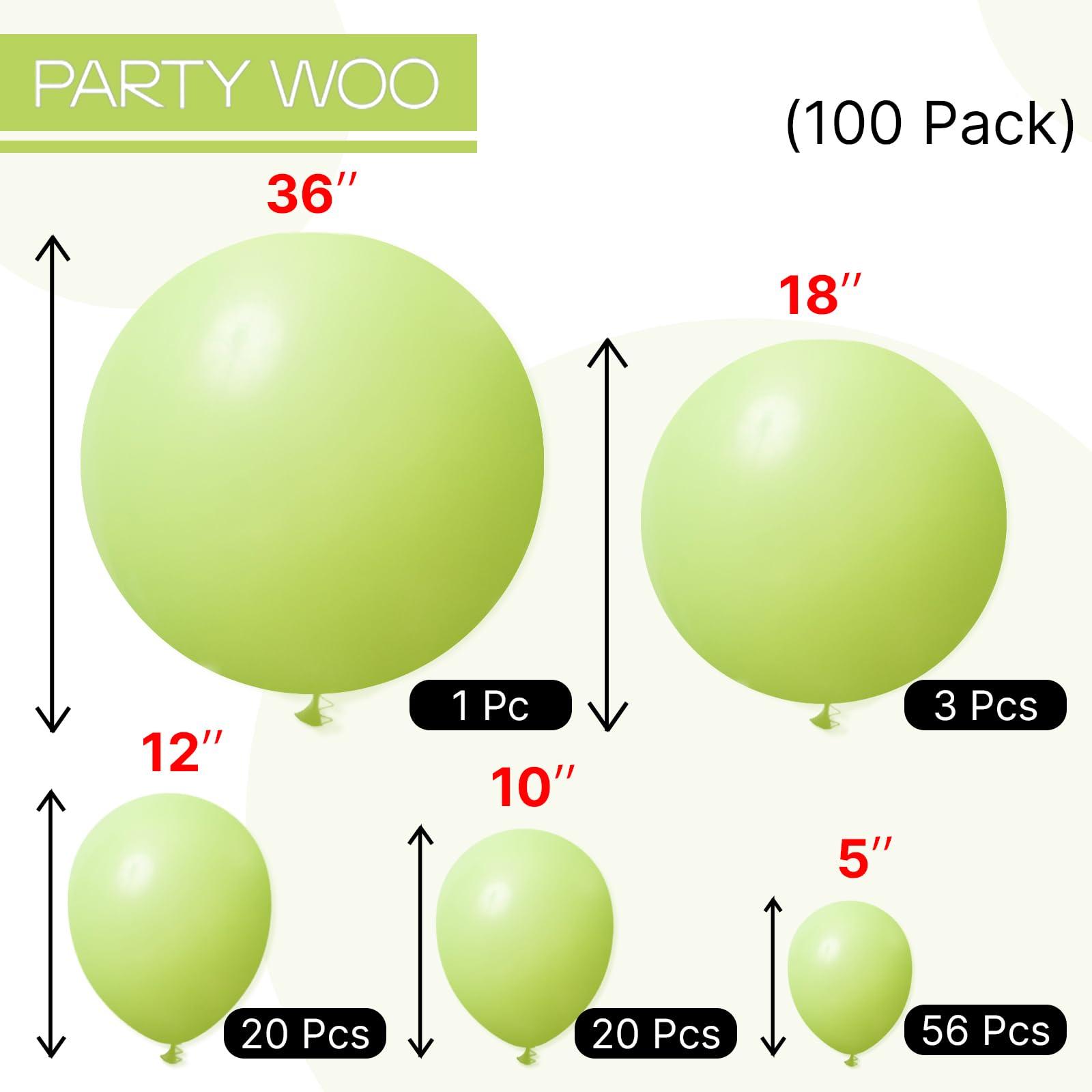 100 PCS GREEN BALLOONS DIFFERENT SIZES: Package includes 36 inch balloon (1 pc), 18 inch balloons (3 pcs), 12 inch balloons (20 pcs), 10 inch balloons (20 pcs), 5 inch balloons (56 pcs)