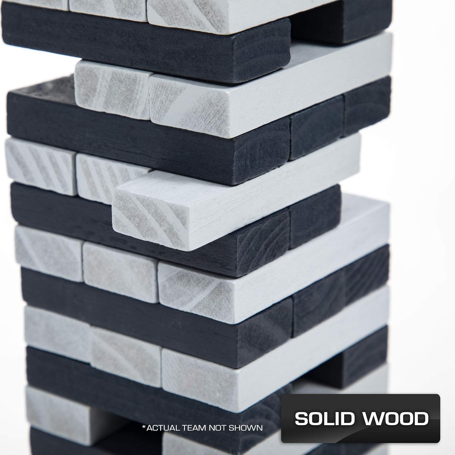A CLASSIC JENGA GAME, IN YOUR FAVORITE NFL TEAMS - A wooden block game that challenges players to push and pull stacking blocks from the tower and strategically place them back on top. Last player standing without knocking the tower down, WINS.