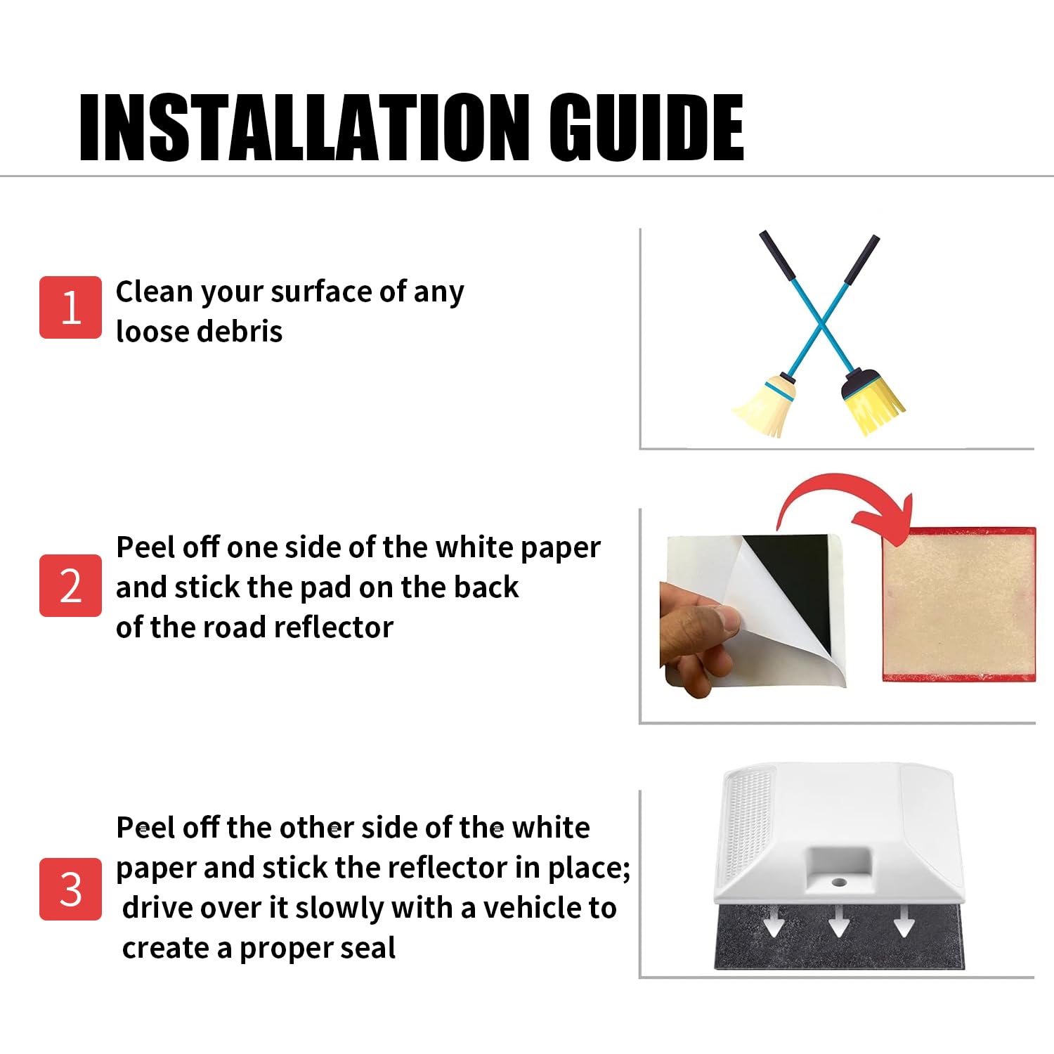 Time Saver: Peel, Stick and Press! No bulky equipment & tools needed! Upon installation, put pressure on the reflectors for 30 seconds with body weight or vehicle tire. Clean the surface before use.
