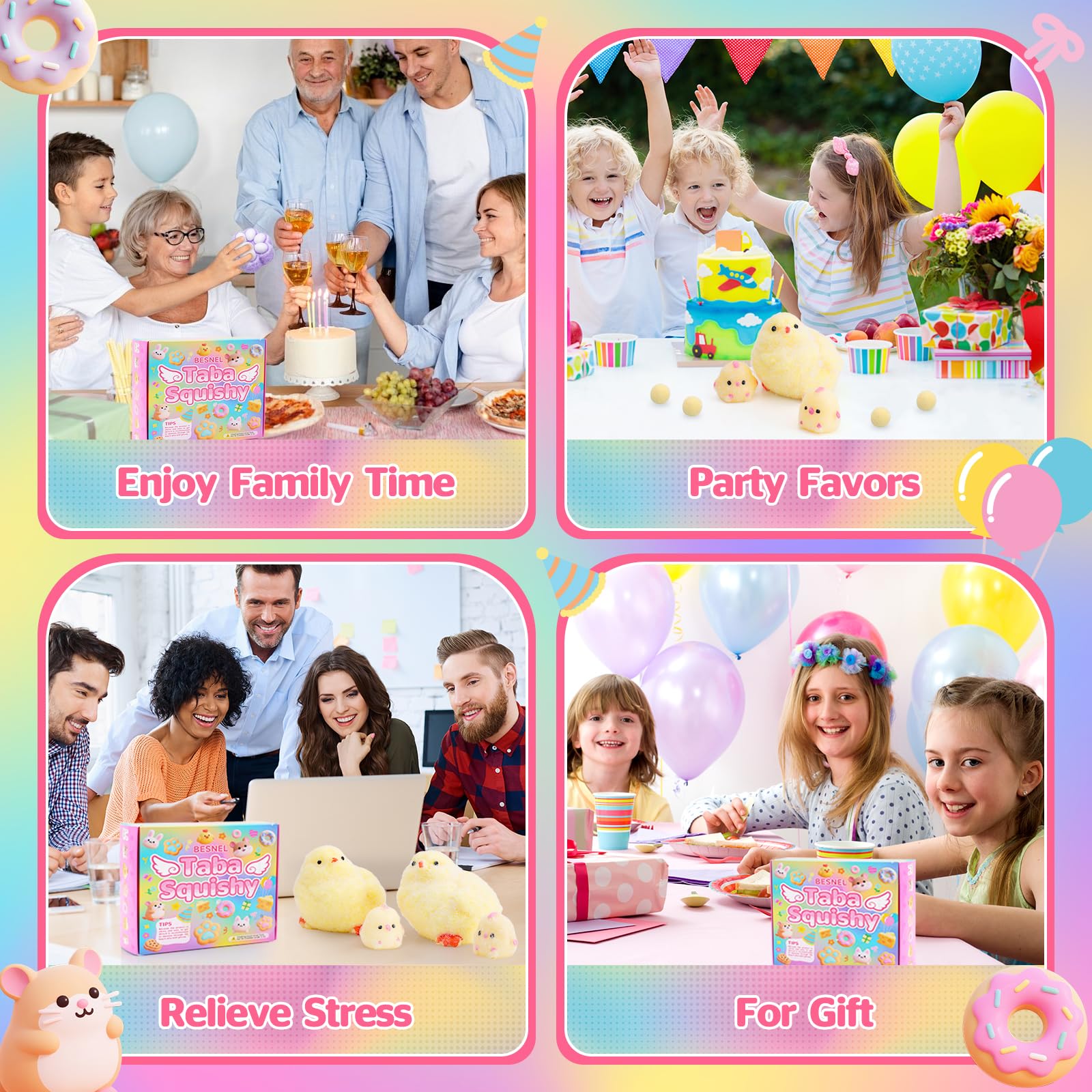 【The Perfect Gift Kit】A set of products includes varying sizes 6 cute chicks: Two hens, four chicks, accompanied by an exquisite gift box. Can be used as birthday and party gifts, classroom prizes, etc., to add fun to parties and classes. The taba squishy chick toys are also the best choice for various holiday gifts, such as Thanksgiving, Halloween, Christmas, etc.