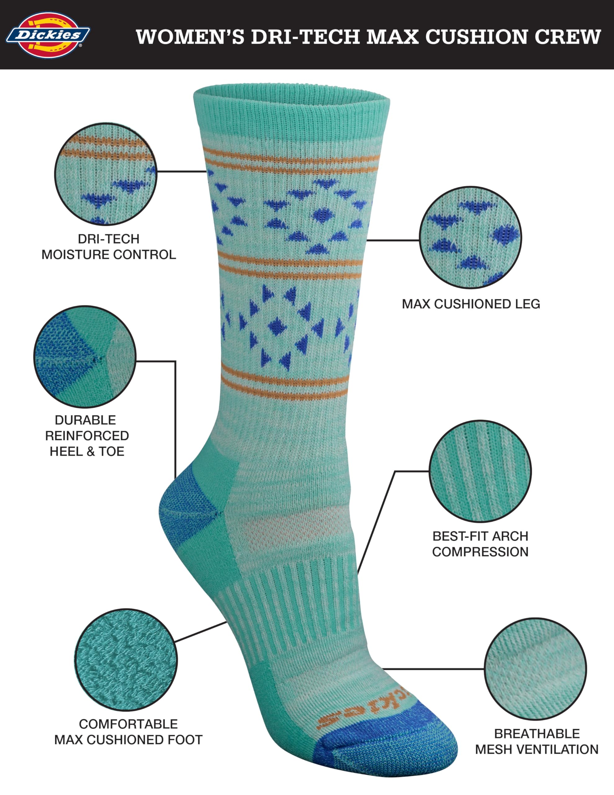 Description Dickies dri-tech moisture control for women's crew socks combines moisture wicking fibers and mesh ventilation channels to keep feet dry and comfortable. Since 1922 Dickies has been making hard-duty work products built to stand up to whatever life throws at you. Dickies Work Socks are built with purpose to deliver superior comfort and performance on and off the job. Dri-tech Moisture Control Sock Collection features: Moisture Management to help keep your feet cool, dry, and comfortable throughout the day.