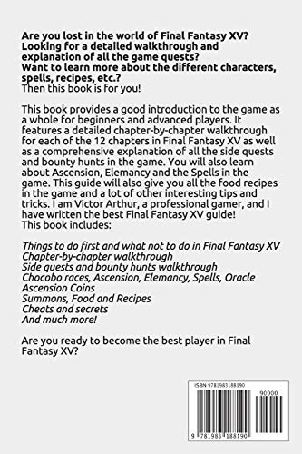 Are you lost in the world of Final Fantasy XV? Looking for a detailed walkthrough and explanation of all the game quests? Want to learn more about the different characters, spells, recipes, etc.? Then this book is for you! This book provides a good introduction to the game as a whole for beginners and advanced players. It features a detailed chapter-by-chapter walkthrough for each of the 12 chapters in Final Fantasy XV as well as a comprehensive explanation of all the side quests and bounty hunts in the game. You will also learn about Ascension, Elemancy and the Spells in the game. This guide will also give you all the food recipes in the game and a lot of other interesting tips and tricks.I am Victor Arthur, a professional gamer, and I have written the best Final Fantasy XV guide! This book includes: Things to do first and what not to do in Final Fantasy XV Chapter-by-chapter walkthrough Side quests and bounty hunts walkthrough Chocobo races, Ascension, Elemancy, Spells, Oracle Ascension Coins Summons, Food and Recipes Cheats and secrets And much more! Are you ready to become the best player in Final Fantasy XV? Scroll up, hit that buy button!