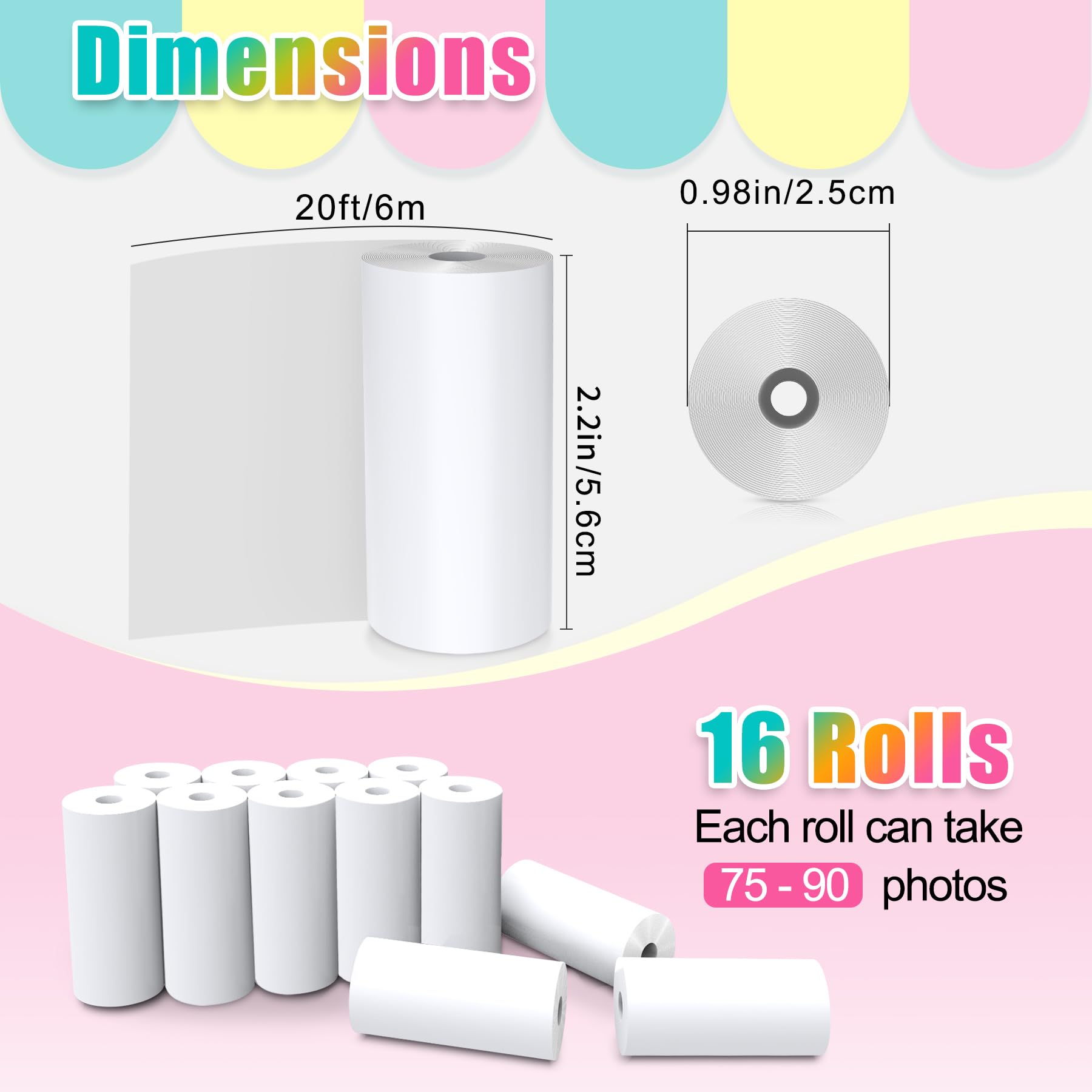 [16 Rolls Print Paper]: Include 16 rolls instant camera refill print paper.Each roll of paper is about 2.2 in × 20 ft and can print about 75-90 photos.Enough quantity for kids to replace and use for a long time