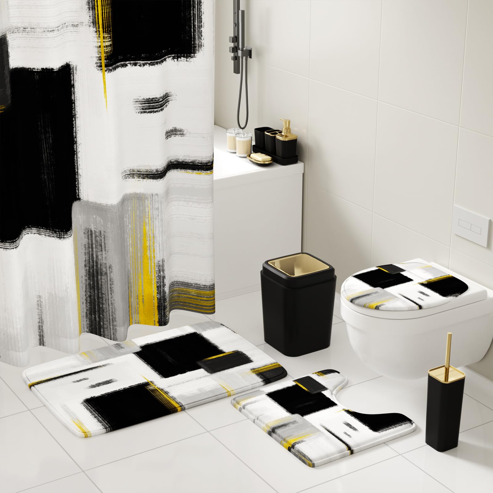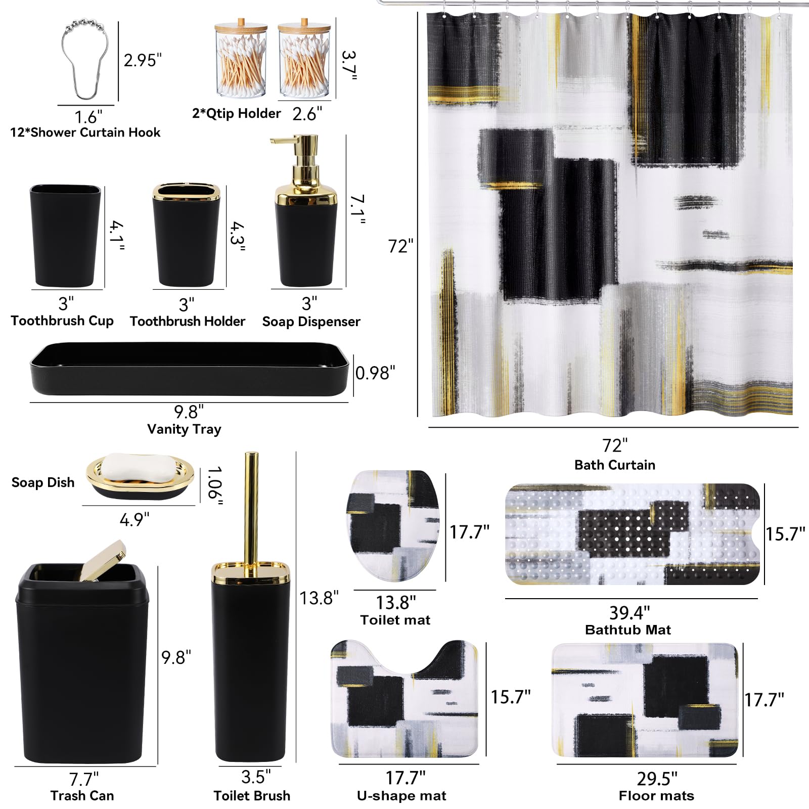 ใ๐๐๐ญ๐ก๐ซ๐จ๐จ๐ฆ ๐๐๐ญ๐ฌ ๐ฐ๐ข๐ญ๐ก ๐๐ก๐จ๐ฐ๐๐ซ ๐๐ฎ๐ซ๐ญ๐๐ข๐ง, ๐๐ฎ๐ ๐ฌ ๐๐ง๐ ๐๐๐ญ๐ก๐ญ๐ฎ๐ ๐๐๐ญใIncludes 3 bathroom rugs, 1 bathtub mat, soap dispenser, toothbrush holder, tumbler, soap dish, bathroom trash can, toilet brush and holder set, bathroom tray, 2 qtip holders, 12 shower curtain hooks, and printed shower curtain set.