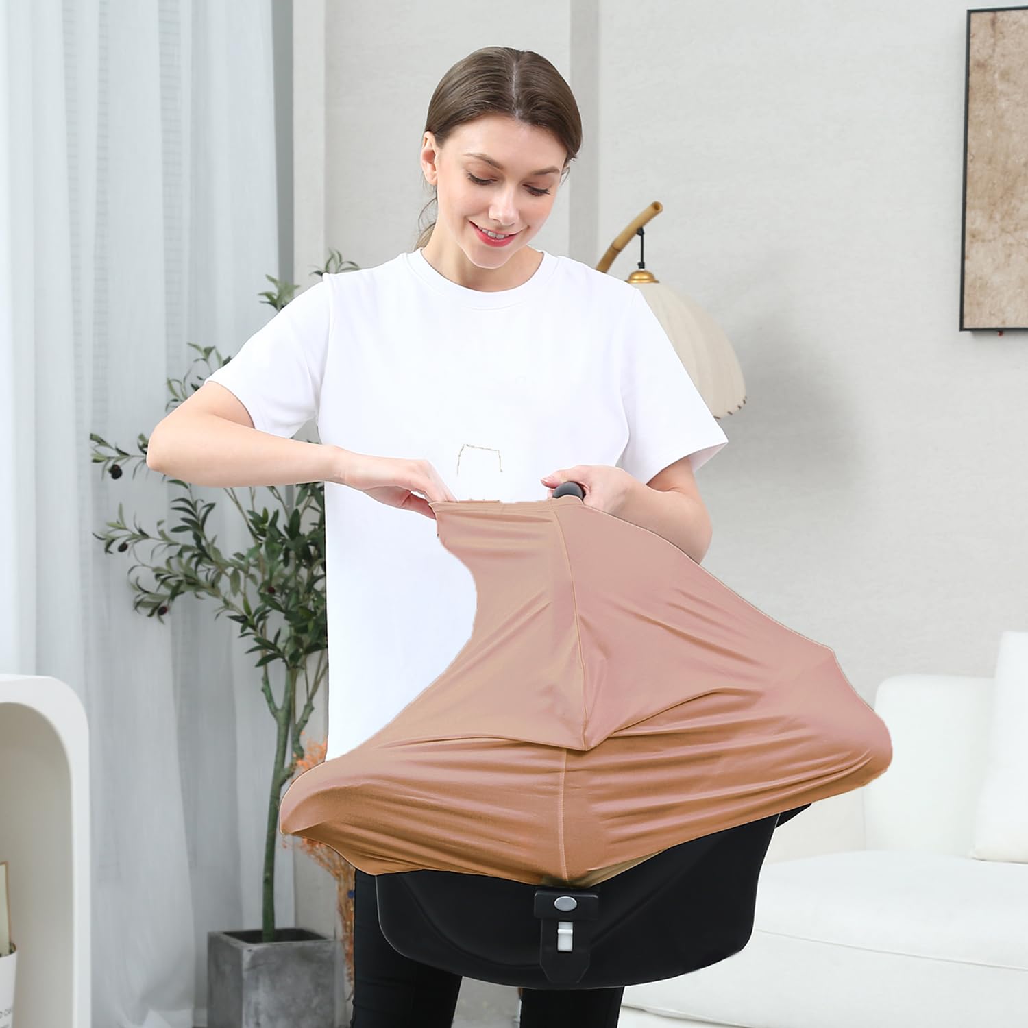 BREATHABLE & STRETCHY FABRIC: Our car seat cover made of buttery soft, breathable and stretchy premium quality fabric that is specially designed to provide maximum airflow (top have a open hole). It's doesn't need any zippers / snaps to fixed on the carseat, it's very easy to use. 27.45 * 25.39 inches size provides full coverage and enough space while nursing. Create a cooling, soft and quite environment for your baby.
