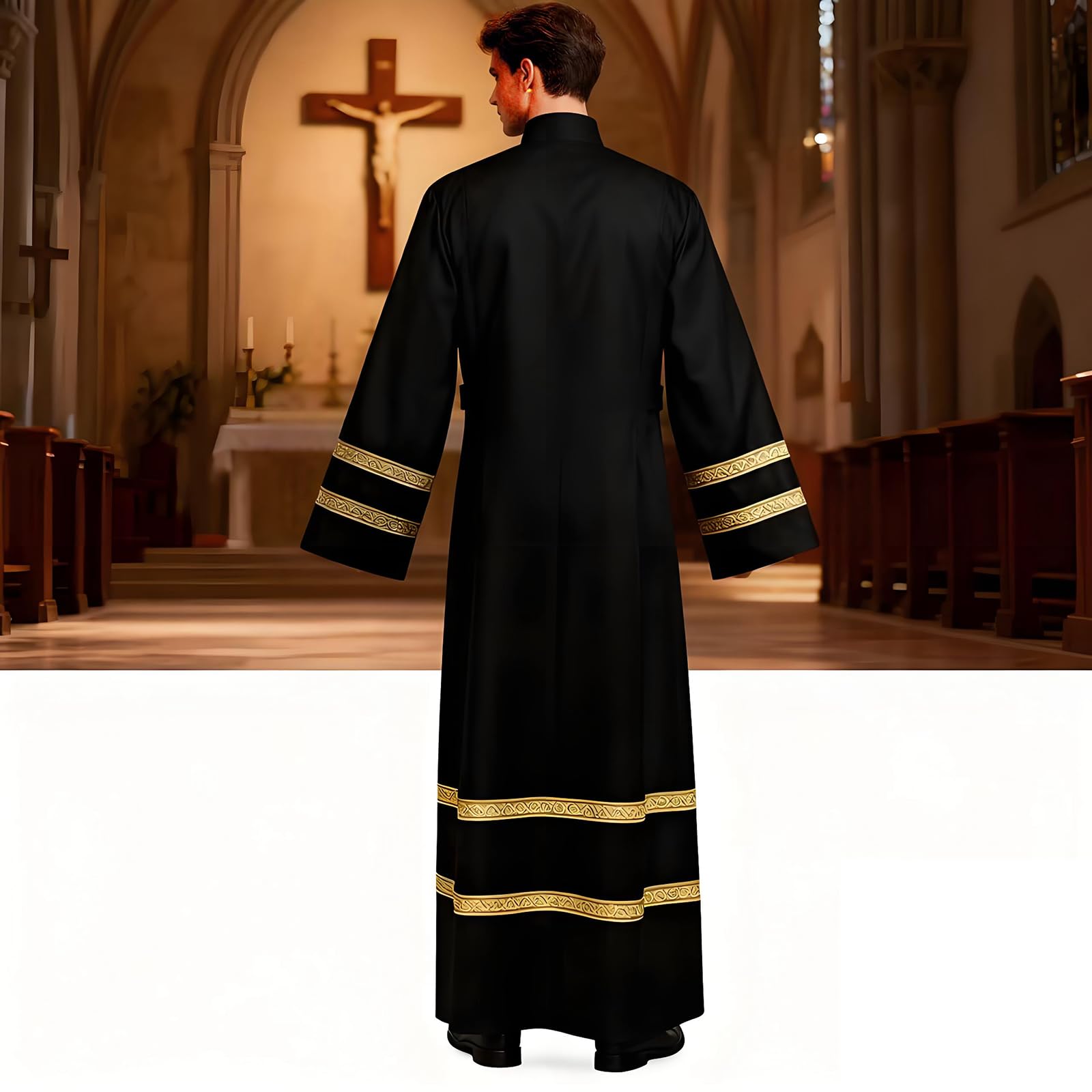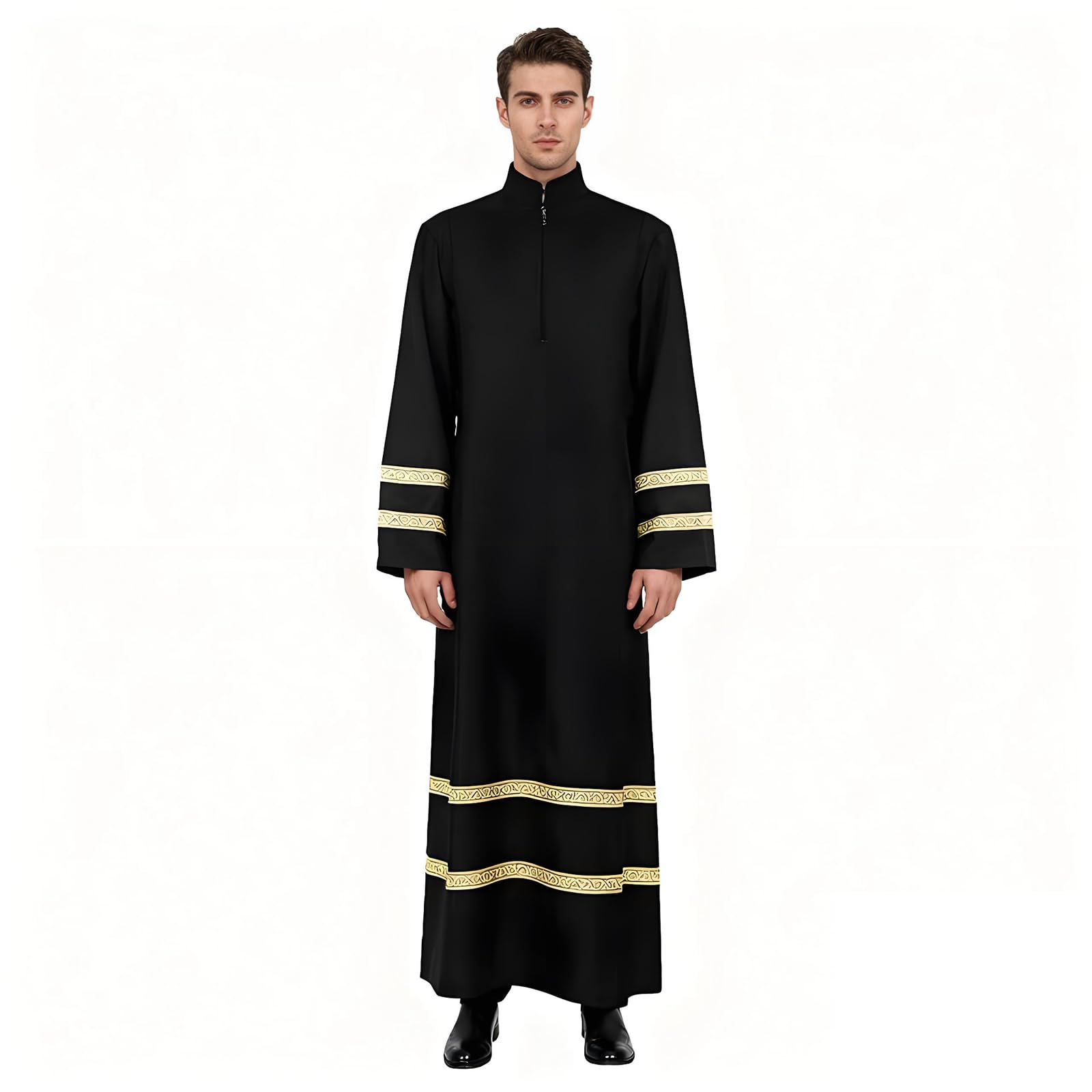 Description Discover our men's elegant clergy robes, tailored for those who value sophistication and functionality. These robes are the perfect blend of style and comfort, making them ideal for church services and choir performances. The fabric, complemented by golden embroidery on the sleeves and hems, adds a touch of elegance to any religious or formal occasion. Crafted from high-quality material, these robes ensure durability and comfort, even during extended wear. Versatile and practical, our clergy robes are easy to care for, with machine washability ensuring they remain in pristine condition for years to come. Whether you're a clergy member, choir member, or attending a formal event, these robes are a must-have addition to your wardrobe.