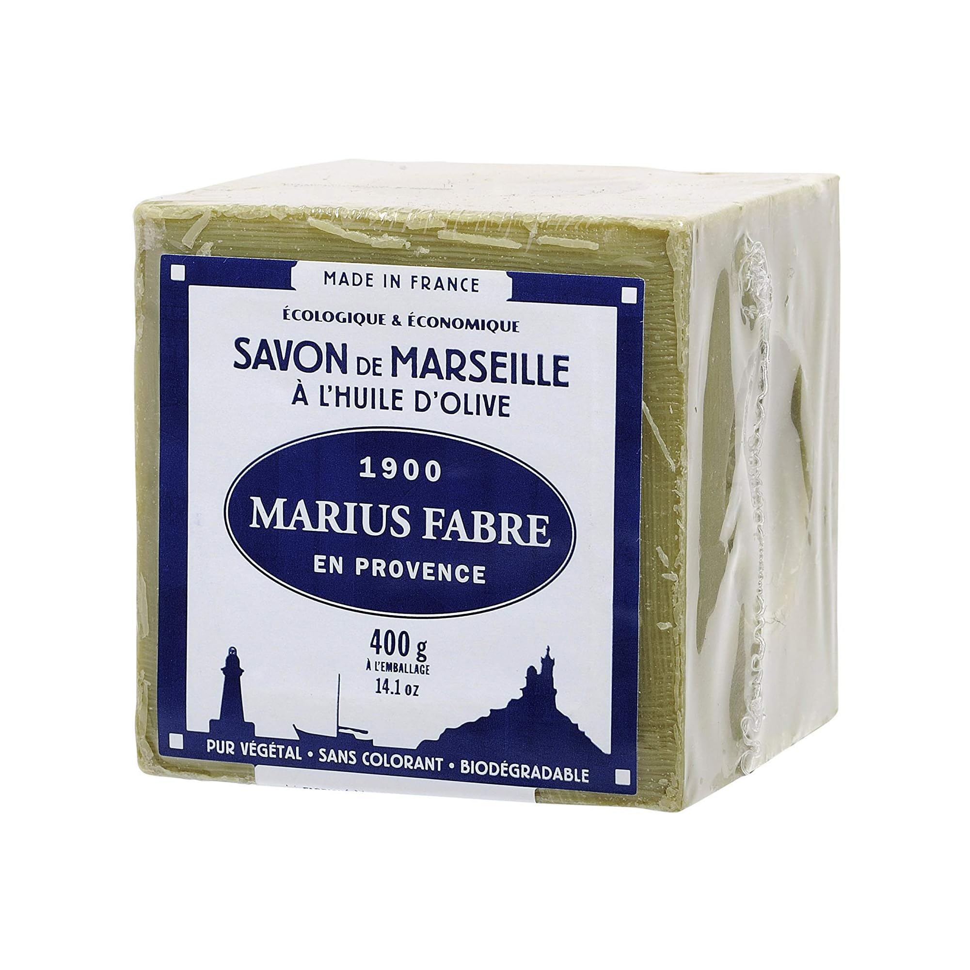 This is a pack of 4 natural olive soap cubes. Each cube measures 3.1 x 3.1 x 3.1 inches and weighs 14.1 ounces. The genuine Marseille soap cube is 100% natural, made exclusively from vegetable oils, 72% of which is olive oil. It contains no added fragrances, colorings, or additives. It is free from petroleum-based products and animal fats, setting it apart from most other soaps and shower gels on the market. The nourishing properties of olive oil help the skin maintain a natural moisture balance. This soap is gentle enough for all skin types, including the most sensitive ones such as babies and those with allergies. It is produced using traditional Marseille soap-making methods, cooked in cauldrons for about 10 days.