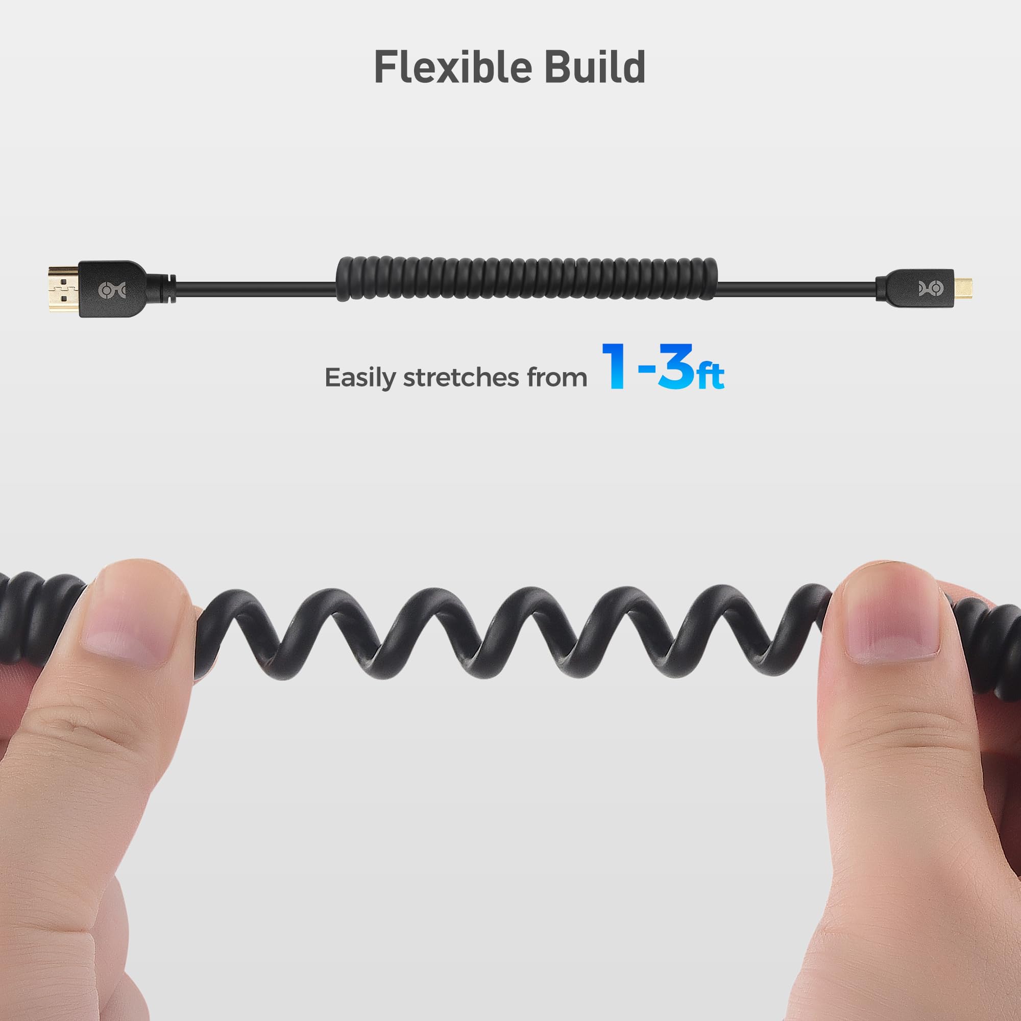 Compact Retractable Design: This coiled micro HDMI to HDMI cable offers a flexible reach from 1 to 3 feet, ideal for connecting laptops, cameras to portable displays, reducing cable slack, and maintaining an organized workspace.