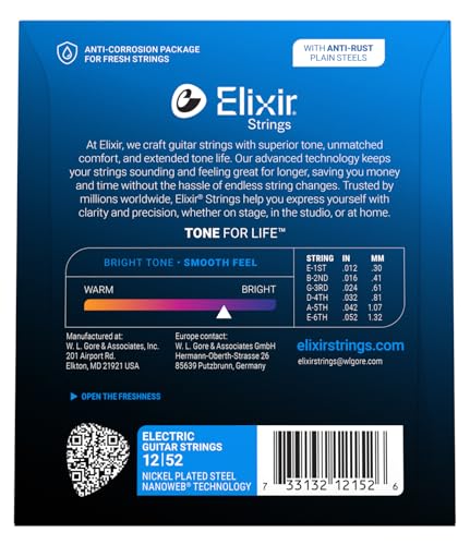 CONTENTS: 1x Elixir Strings, Electric Guitar Strings, Nickel Plated Steel with NANOWEB Technology, Longest-Lasting Bright Tone with Comfortable Feel, 6 String Set, Heavy 12-16-24-32-42-52