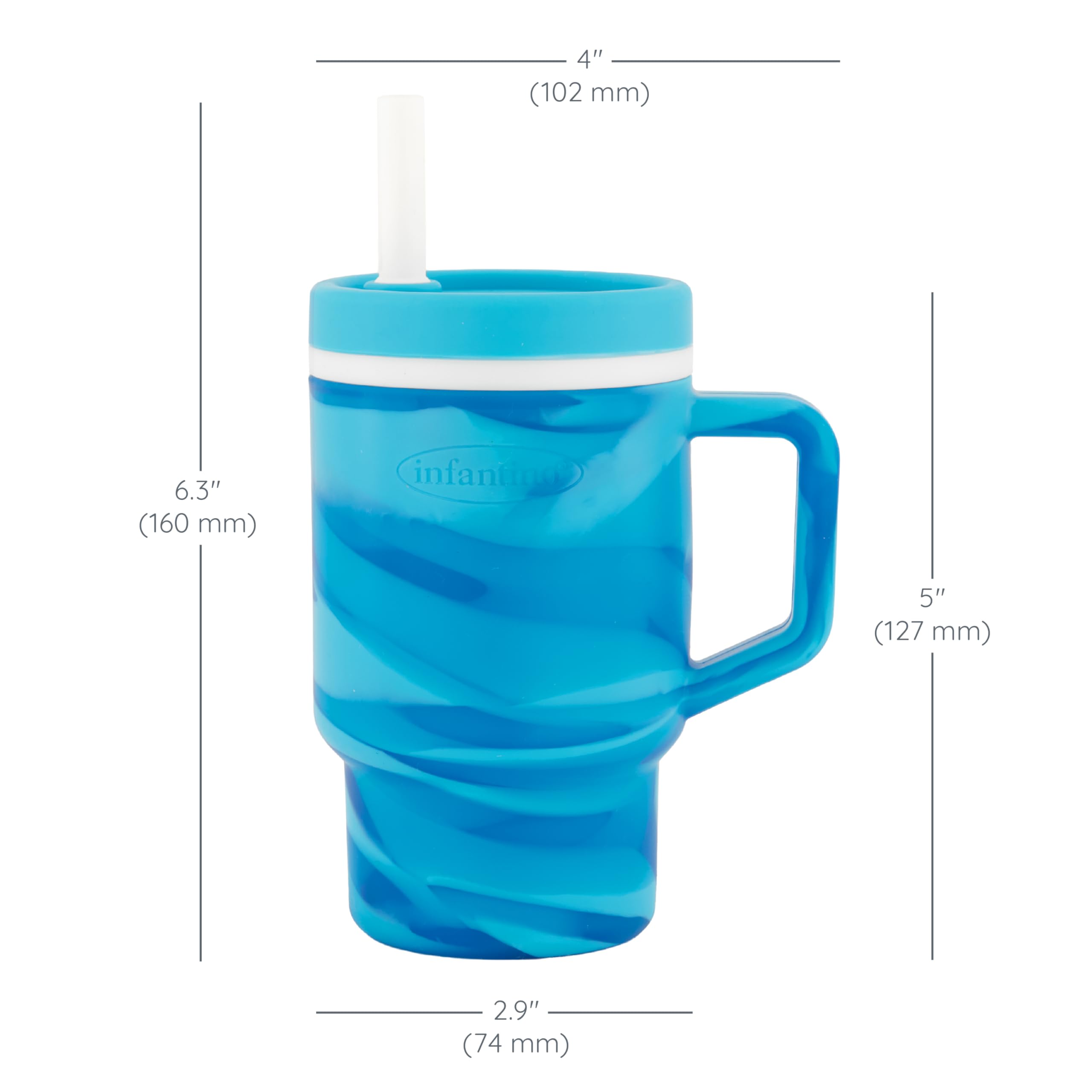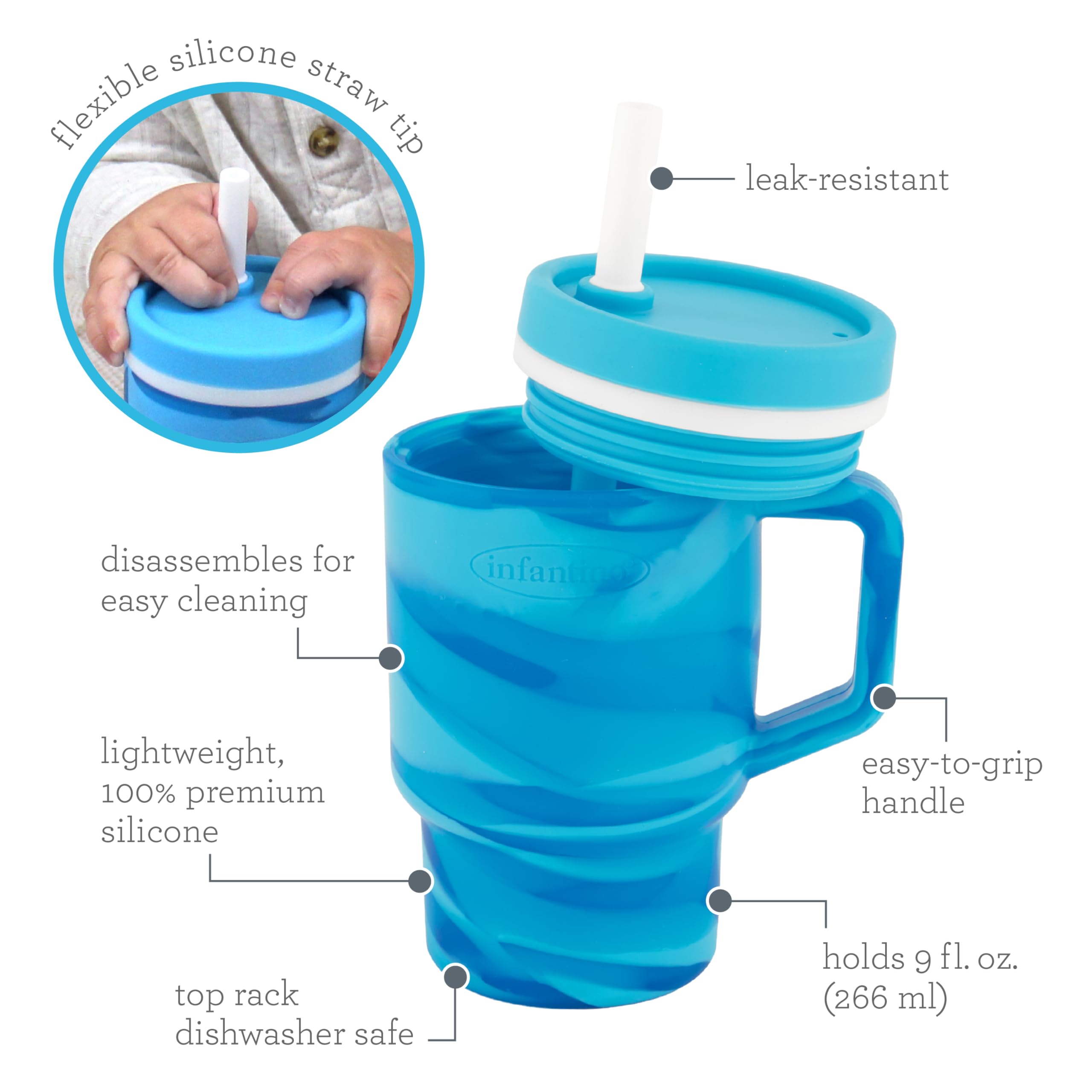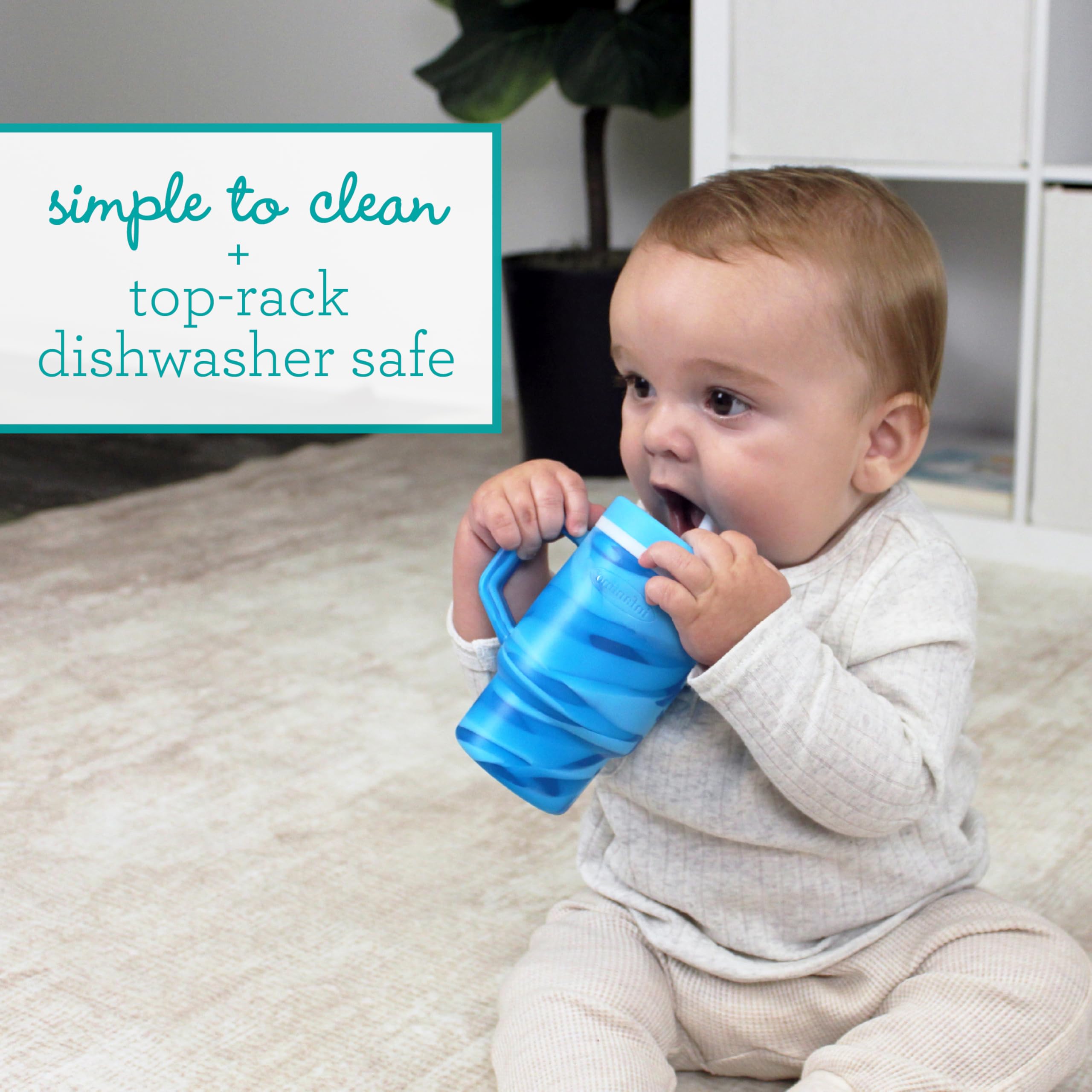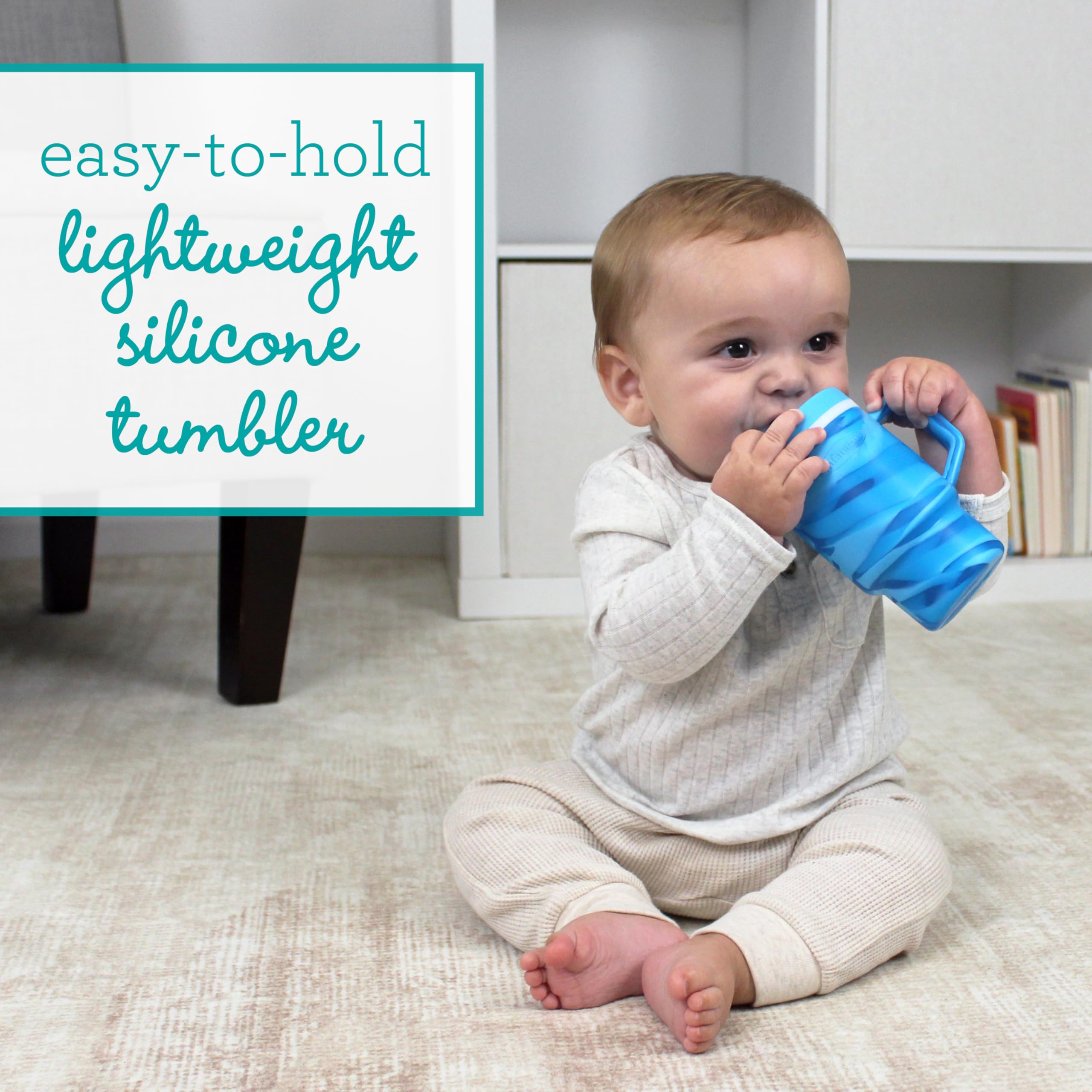 The Infantino My 1st Tumbler is a baby-friendly silicone sippy cup that looks just like Mom’s favorite tumbler – only perfectly sized for little hands. With a soft, flexible design and 9oz capacity, it’s made to help babies build sipping skills while feeling just like the grown-ups. Crafted from 100% food-grade, BPA-free silicone, this tumbler features a sturdy handle and a soft straw with an internal valve that allows smooth sipping and helps prevent spills – even when turned upside down. The no-pull-out straw stays secure for baby but comes apart easily for parents to clean. Perfect for water, milk, or juice, this baby tumbler fits most stroller and car seat cup holders and packs easily into a diaper bag. Dishwasher safe and made for everyday use, it’s a stylish, smart essential for keeping little ones hydrated wherever the day takes you.