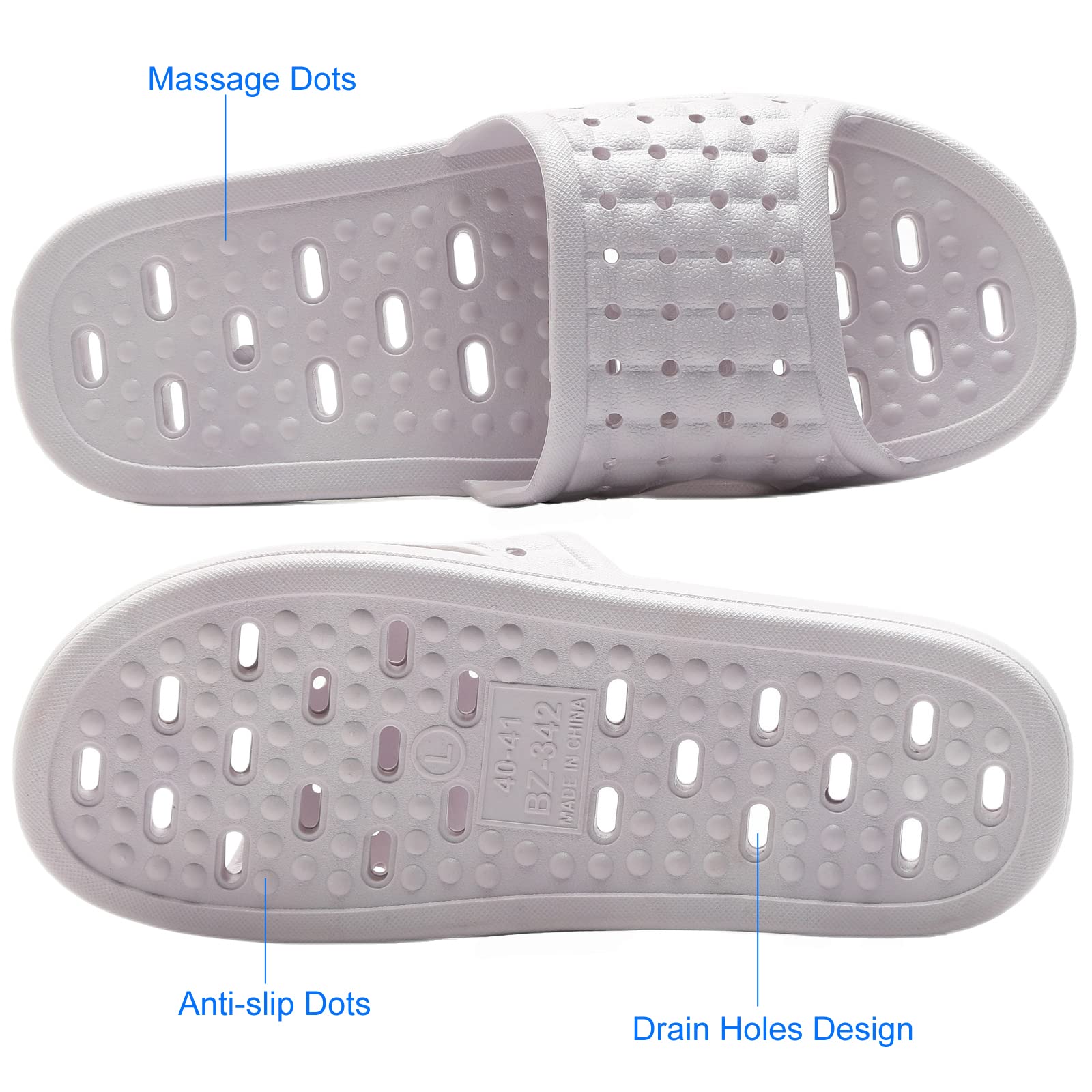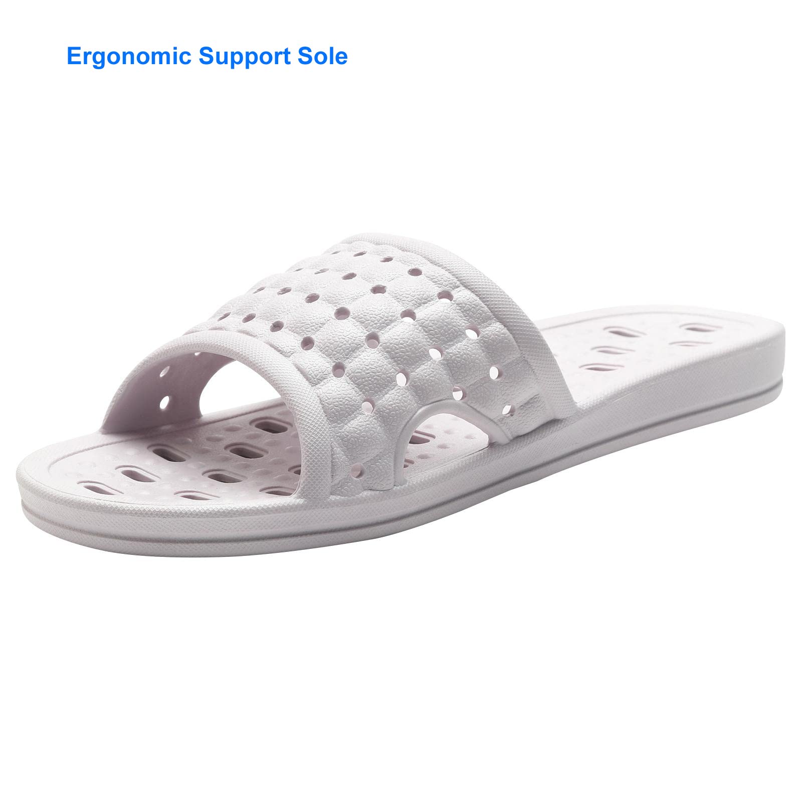 COMFORT & RELAX – The shower slides have soles with a upwarp designed for ergonomic support, relieve the pressure brought by toes when walking, they are comfortable to wear. The upper soles have tiny little bumps that stimulate your feet a little bit which helps to get the blood flowing, help to make your feet feel better and more relaxed.
