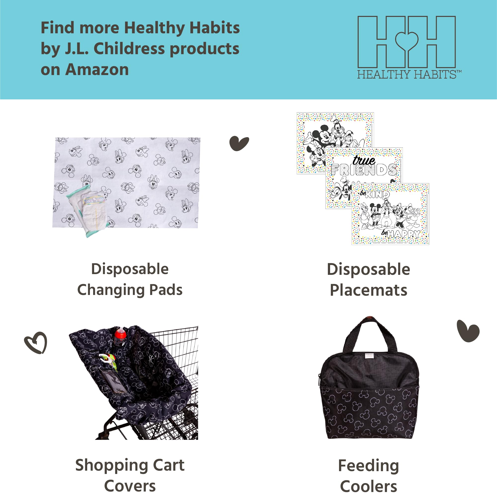 "Disney Baby by J.L. Childress Disposable High Chair Covers provide protection from dirt on restaurant and wooden high chairs. Each cover is individually wrapped and is compact and portable for easy use on-the-go. A magical Mickey and Minnie Mouse pattern decorates this pack of 12 covers. The covers fit all standard restaurant-style and wooden high chairs. Openings on the sides of the cover allow you to safely secure your child with the high chair's attached straps, threading them through the openings. Easily throw away messes after each use - no clean-up needed! We're the Childress Family - Nice to Meet You! For over 30 years, J.L. Childress has been committed to making your next family adventure a little easier. Our US-based, family owned company is run by moms & dads just like you and we stand behind our products 100%. If you need anything, just give us a call! Disney Baby by J.L. Childress products aim to add a little magic to your adventures around the block or around the world."