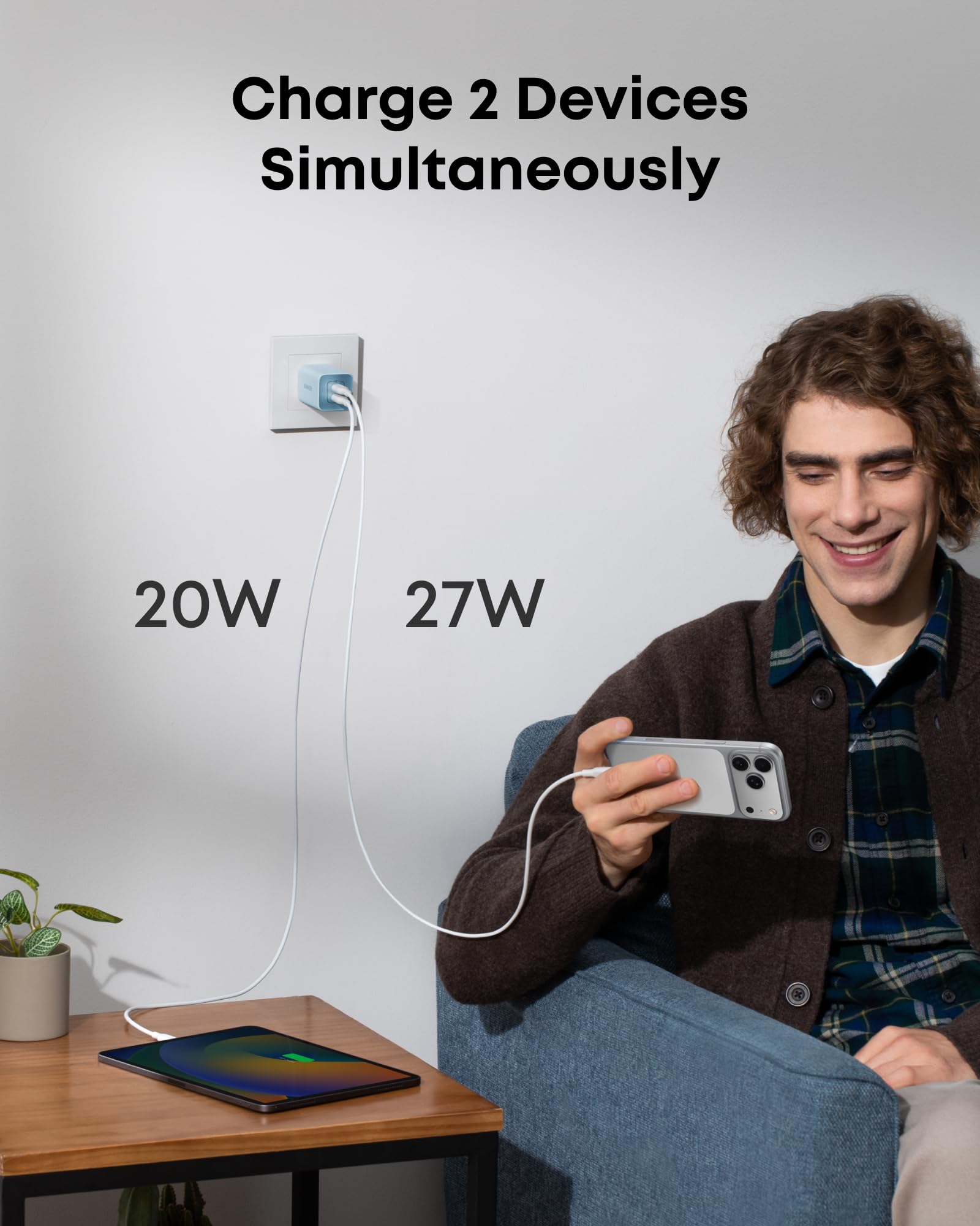 Charge 2 Devices at Once: With 27W from one USB-C port, and 20W from the other, you can fast charge your iPhone and your iPad at the same time.