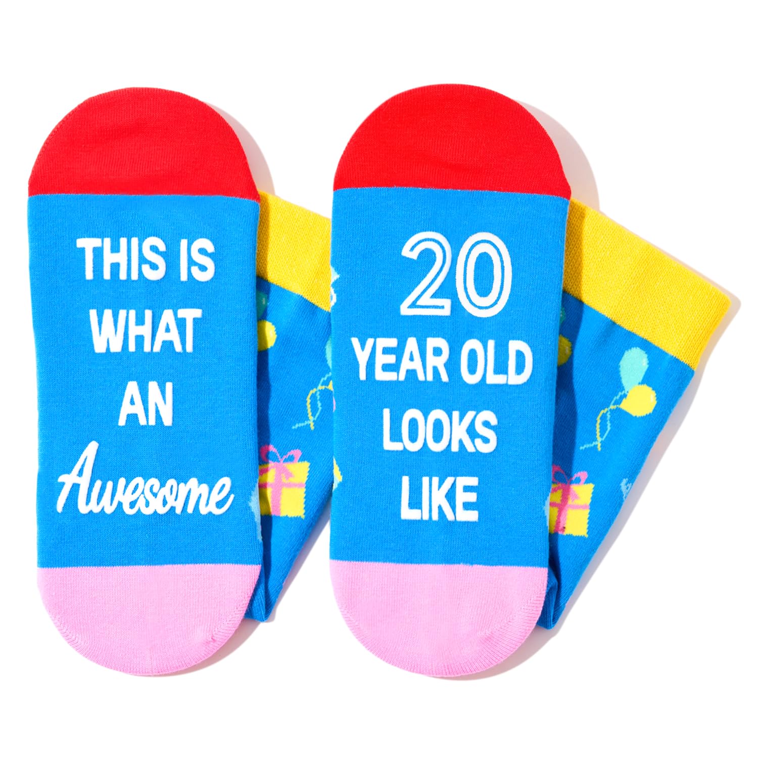 GIFTS FOR 20 YEAR OLDS: These socks feature birthday gifts, balloons, cakes, and other elements on the top, while the bottom features a hilarious secret message written in non-slip ink: "THIS IS WHAT AN Awesome 20 YEAR OLD LOOKS LIKE." They are suitable for any holiday gifts, such as Birthday gifts, Christmas gifts, or White Elephant gifts.