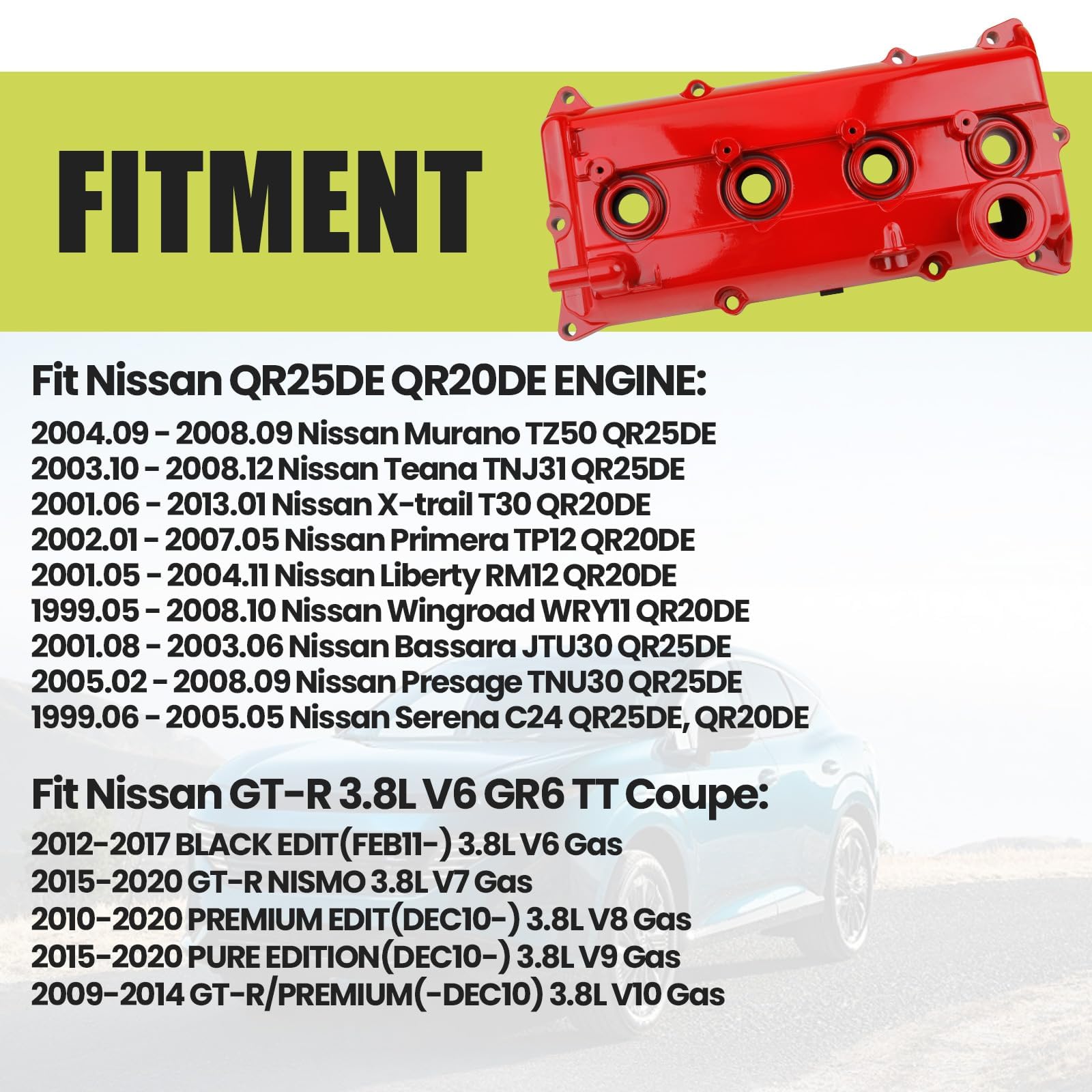 FITMENT 2: Valve Covers compatible with Nissan GT-R 3.8L V6 GR6 TT Coupe: for 2012-2017 BLACK EDIT(FEB11-) 3.8L V6, 2015-2020 GT-R NISMO 3.8L V6, 2010-2020 PREMIUM EDIT(DEC10-) 3.8L V6, 2015-2020 PURE EDITION(DEC10-) 3.8L V6, 2009-2014 GT-R/PREMIUM(-DEC10) 3.8L V6. (See picture for model details. Message us on Amazon if you unsure the fitment)