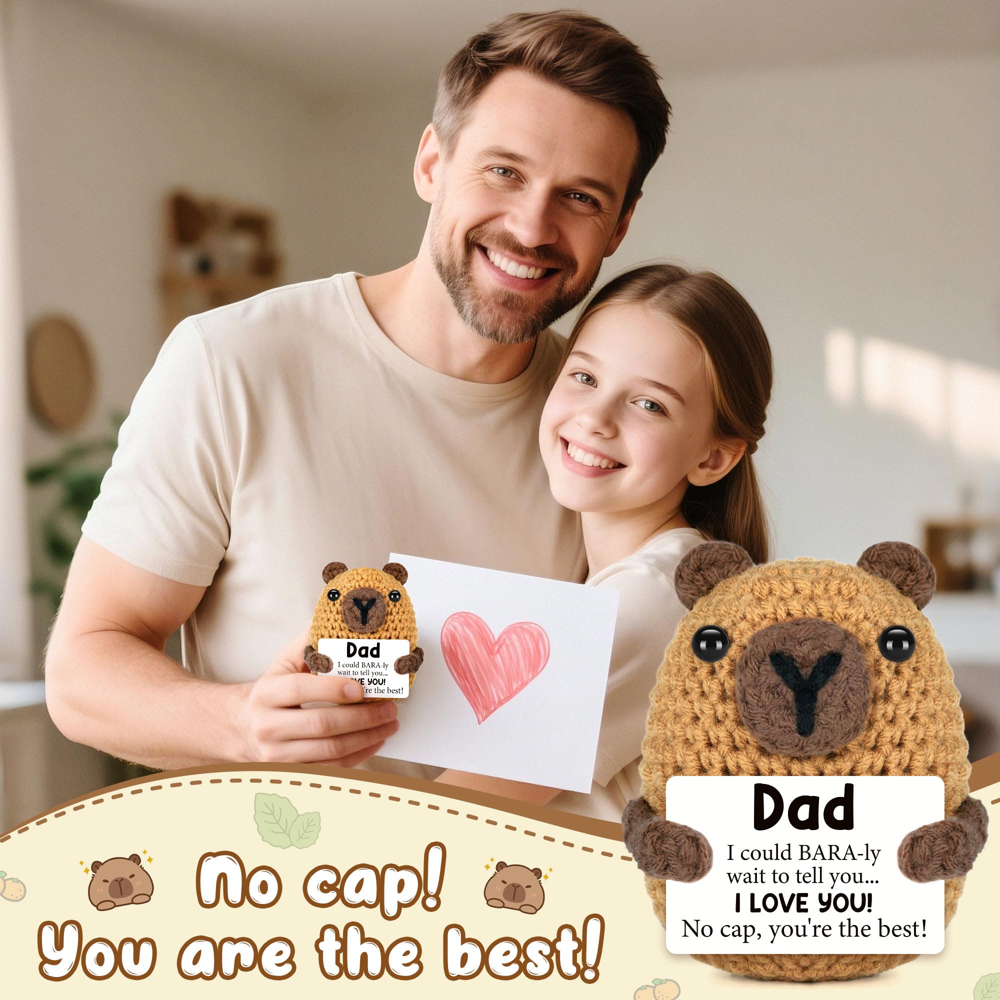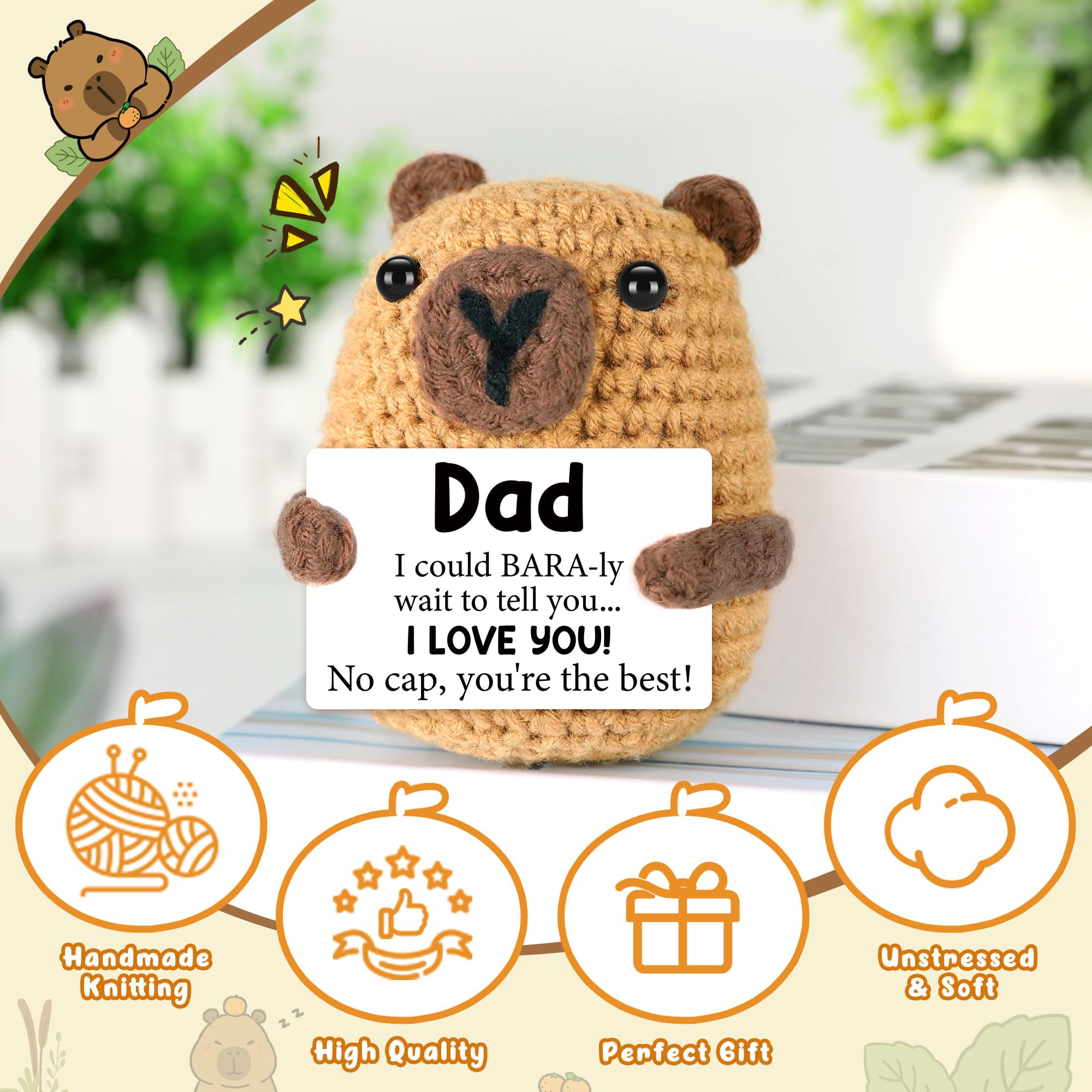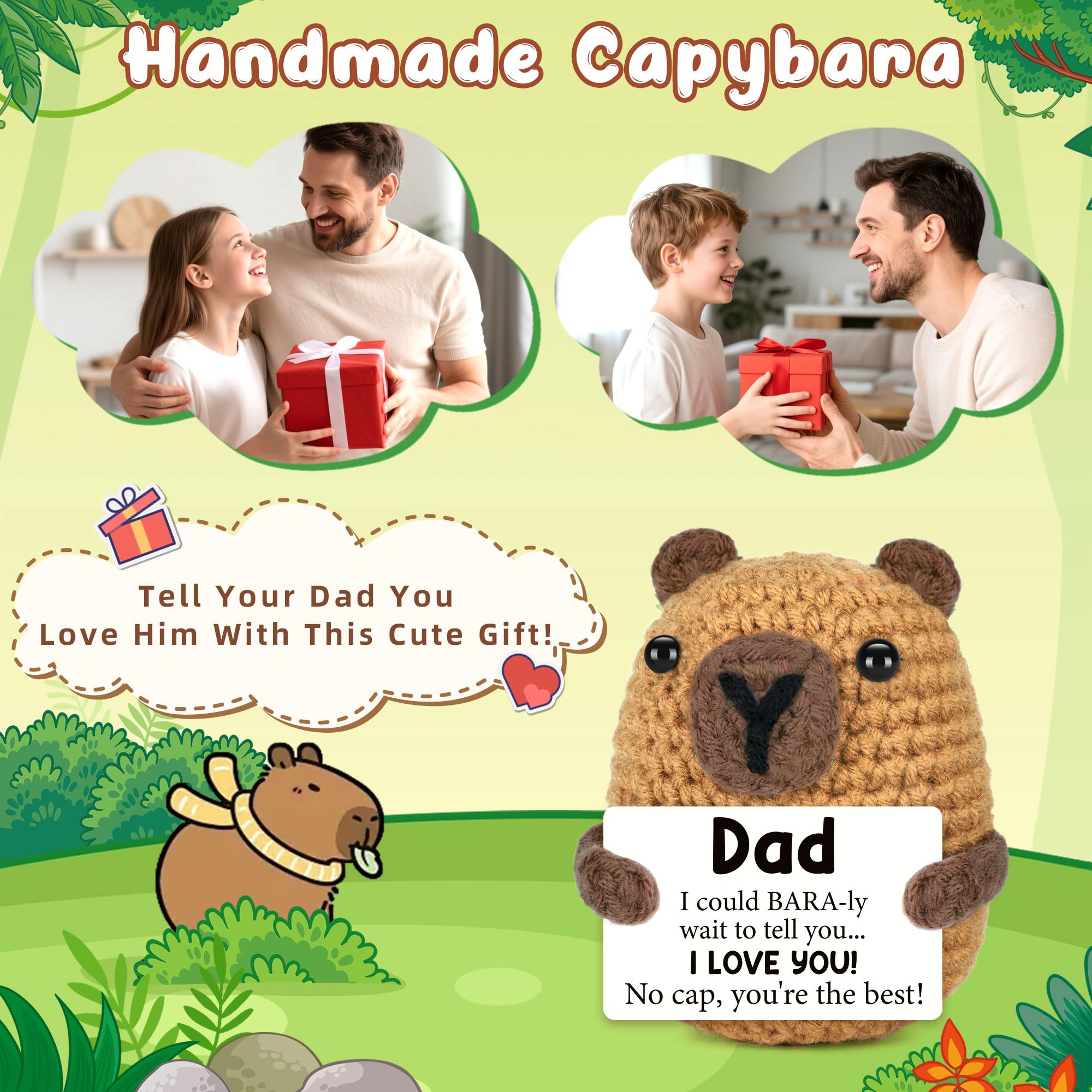 Funny Fathers Day Gift from Daughter or Son – Cute & Meaningful. This adorable crochet capybara holds a sign that says “I could BARA-ly wait to tell you... I LOVE YOU!”—a sweet pun-filled surprise that’ll warm his heart. It’s a perfect gift idea for first-time dads, new dads, or any father who loves animals, humor, and heartfelt tokens from their kids. A must-have if you're looking for a sentimental dad gift that's also totally unique.