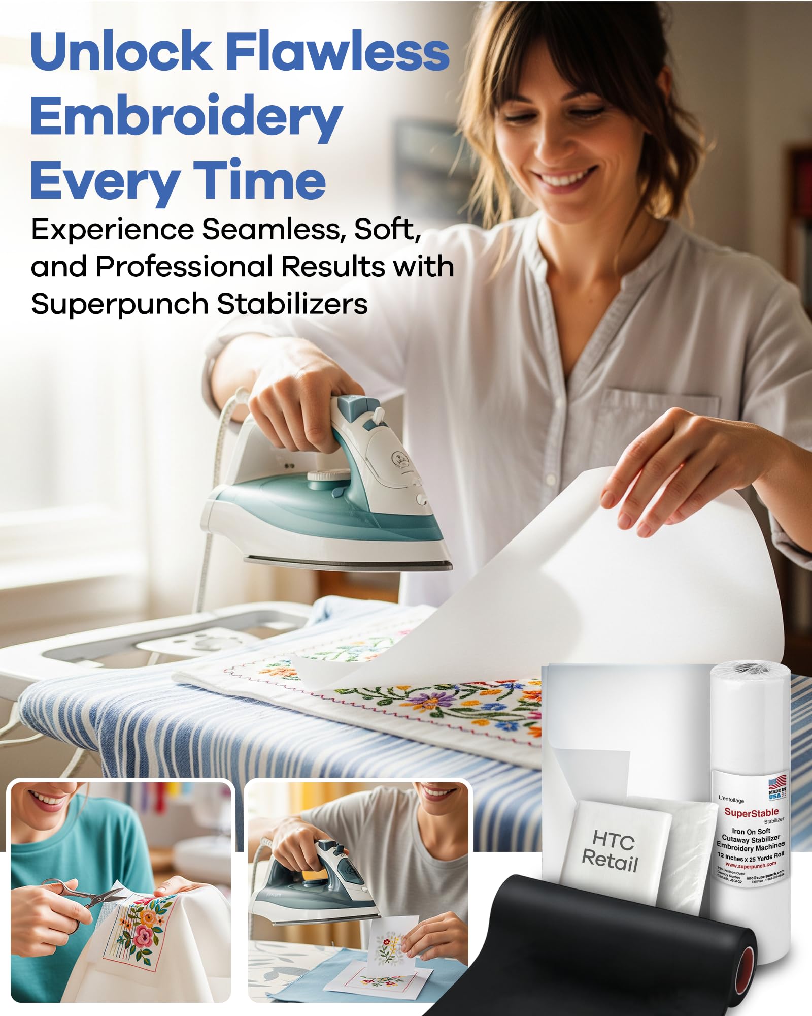 MADE IN USA: Do you want an easy-to-use American-made embroidery backing stabilizer? Look no further! This made-in-USA fusible stabilizer requires no time-consuming preparation – just iron it onto the fabric. This fabric stabilizer stabilizes any fabric in seconds and provides an irritation-free layer between your fabric and the needle. Our USA-made cloud cover stitch backing is great for busy crafters and those who don't have the time for traditional preparation.