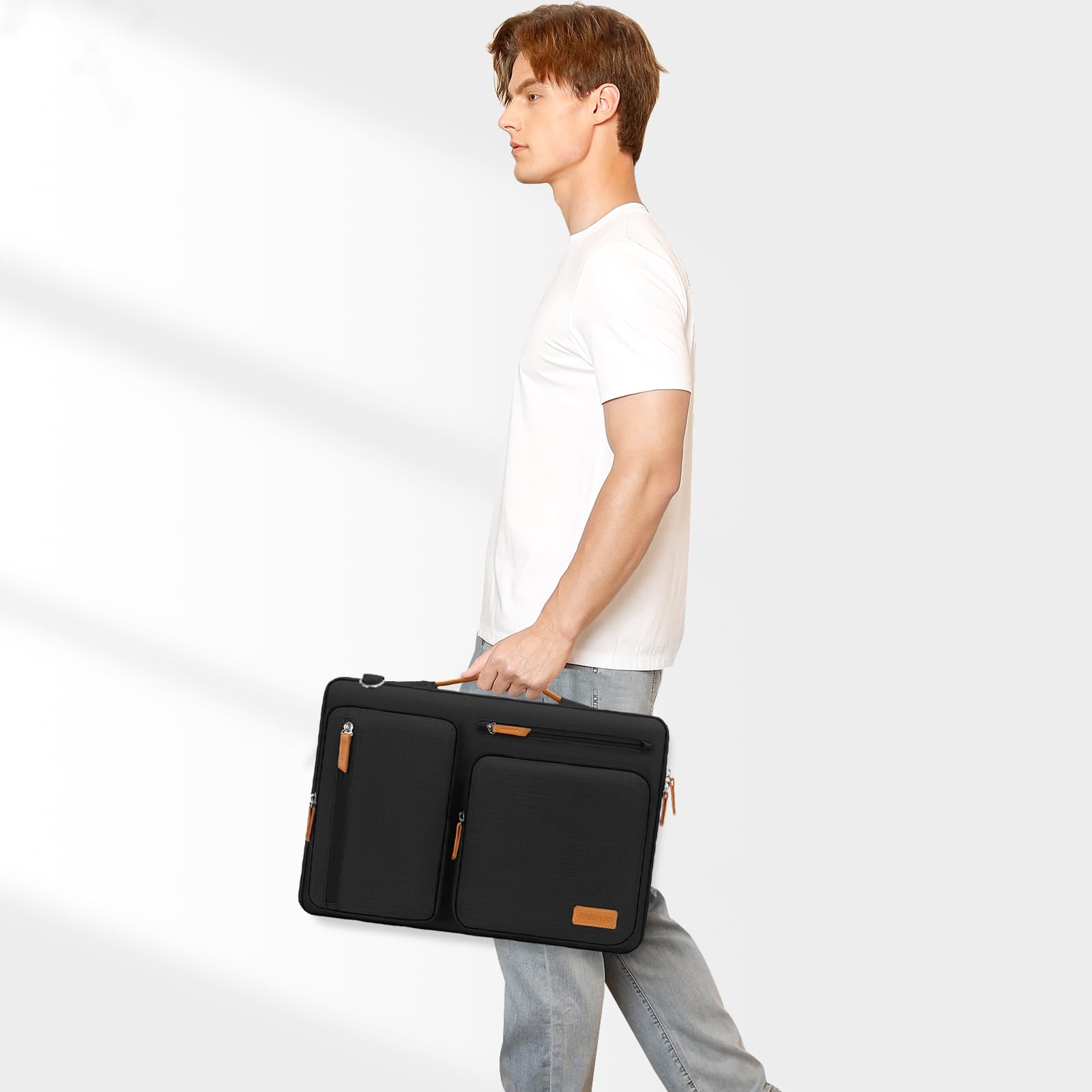The Laptop Sleeve Bag with Handle & Adjustable Shouler Strap. Removable and adjustable padding shoulder strap with a shoulder pad varied from 28.54 inch to maximum 52.56 inch. You can use it as shoulder bag, laptop carrying case, sleeve bag, handle bag, messenger bag, crossbody bag and briefcase in whatever way you like. Extendable PU handle design makes it to carry your laptop around in comfort, you can also tuck away the handle